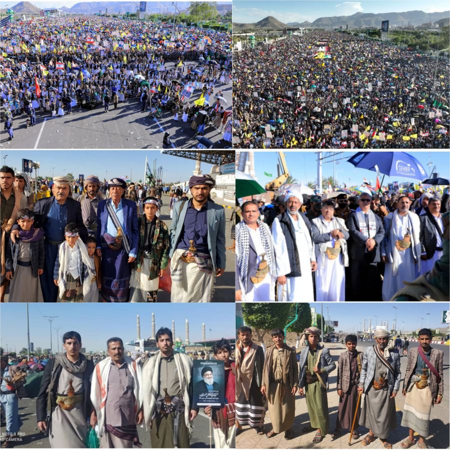 وحملت الجماهير صور شهيد الأمة وقادة المقاومة الذين ارتقوا على طريق القدس نصرة للأقصى وغزة والتصدي للعدوان الصهيوني الأمريكي المجرم ومؤامراته التي تستهدف الأمة العربية والإسلامية ومقدساتها.