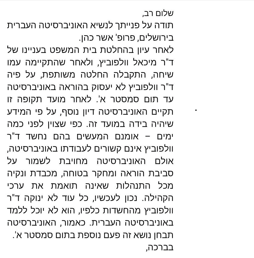 وفي ردّها على مطالبة النائب احمد الطيبي جاء: "شكرًا لتوجهك لرئيس الجامعة العبرية بما يتعلق بالمحاضر ميخائيل فولفوڤتش، قمنا باستجوابه، وبناءً عليه قررنا إيقافه عن العمل مبدأيًا حتى نهاية الفصل الدراسي الأول، وسنناقش القرار مجددًا بعد انتهاء الفصل بما يتناسب مع المعلومات المتوفرة لدينا في حينه، بالرغم من أن أعمال فولفوفيتش، كانت خارج نطاق الجامعة، الا أن الجامعة ملزمة بالحفاظ على بيئة أكاديمية آمنة وخالية من أي عمل غير مناسبة. وطالما تدور الشبهات حوله لن يتمكن من الاستمرار في عمله في الجامعة".