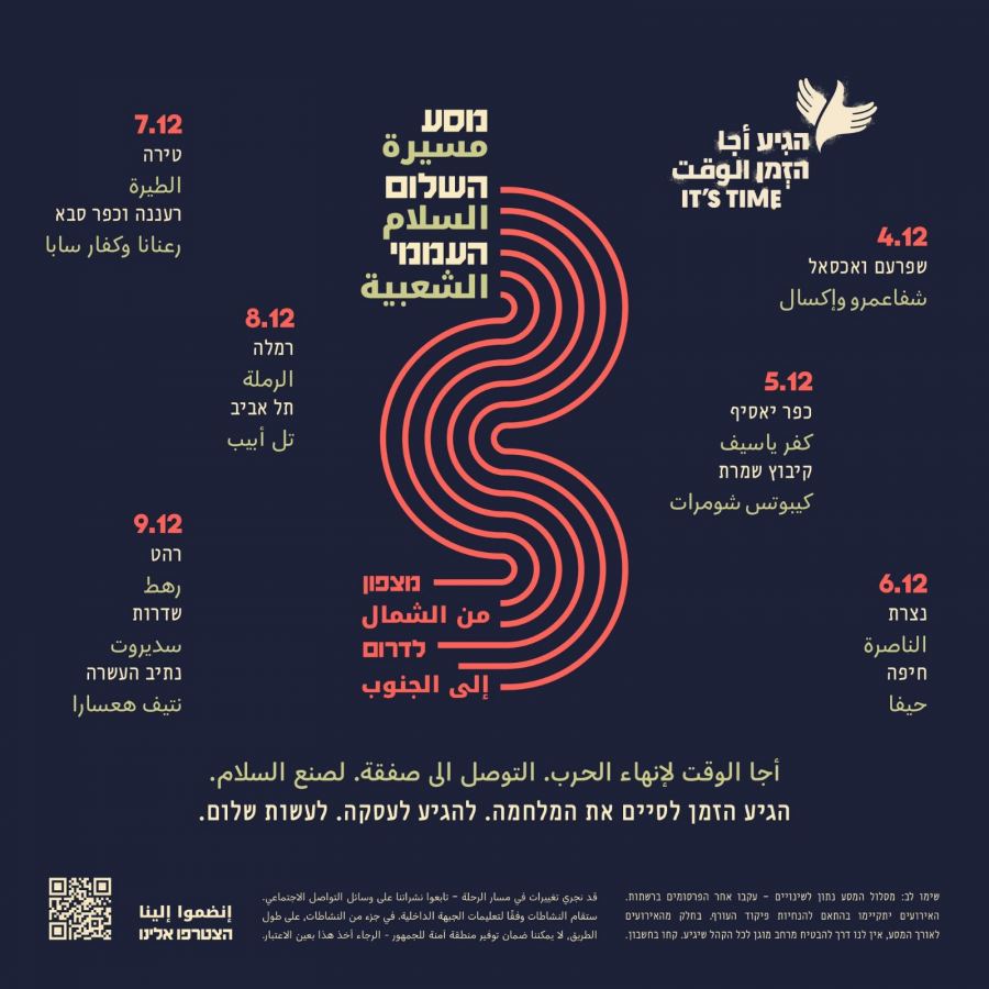 مبادرة "أجا الوقت" تم إطلاقها في يوليو الماضي في عرض قوة مهيب ومؤثر من معسكر السلام في قاعة منورا في تل أبيب، بمشاركة 6,000 شخص، يهود وعرب. الآن، استمرت المبادرة من خلال مسيرة تحمل نفس الاسم: "أجا الوقت"، والتي تجولت من الشمال إلى الجنوب، وشملت سلسلة من اللقاءات والفعاليات في مختلف أنحاء البلاد، في بلدات يهودية وعربية. في كل محطة تم تقديم محتوى مختلف – بدءًا من حوارات وجلسات نقاش، مرورًا بمراسم للذكرى والأمل، وصولًا إلى عروض للأطفال، هيب هوب، روك وغيرها.