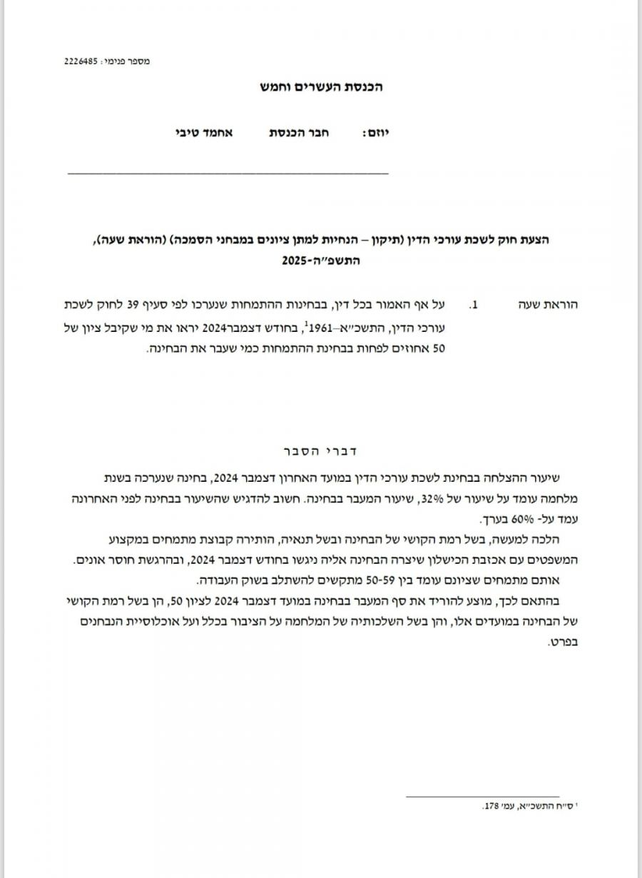 النائب الدكتور احمد الطيبي يتقدم باقتراح قانون يهدف بخفض علامة النجاح بامتحان نقابة المحامين لموعد ديسمبر 2024، من علامة 60 الى 50.