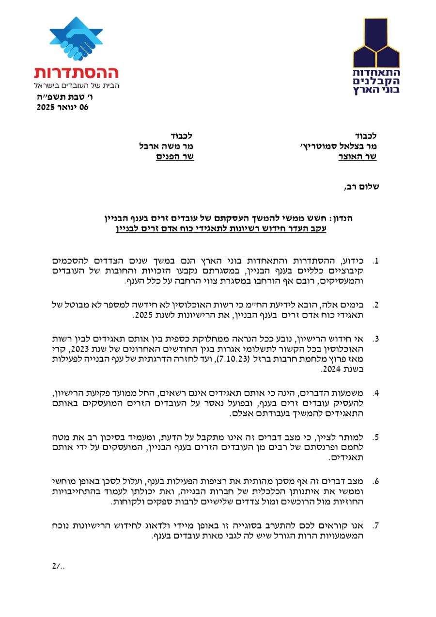 كنوز نت - توجه رئيس الهستدروت، أرنون بار دافيد، ورئيس اتحاد المقاولين في إسرائيل، راؤول سروجو، الى كل من وزير المالية، بتسلئيل سموتريتش، ووزير الداخلية، موشيه أربيل، بطلب التدخل الفوري في الأزمة التي يشهدها قطاع البناء والتي تهدد معيشة آلاف العمال واستقرار الشركات العاملة في هذا القطاع الحيوي.