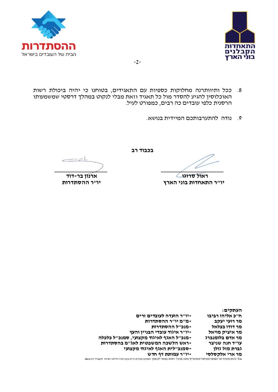 تجدر الاشارة أن الهستدروت واتحاد المقاولين هما الهيئتان الممثلتان لهذا القطاع، وعلى مدى سنوات كانتا الطرفين في الاتفاقيات الجماعية العامة التي تم توقيعها في قطاع البناء، والتي تم من خلالها تحديد حقوق وواجبات العمال وأرباب العمل، حيث تم توسيع معظمها بموجب أوامر التوسعة لتشمل القطاع بأكمله. وأشارت جمعية "داف حداش"، التي تضم العديد من الشركات الجديدة وتعمل جنبًا إلى جنب مع الهستدروت في هذا المسار، اشارت إلى أنها ستواصل العمل بكل جهد في هذه القضية "لضمان مستقبل أفضل للقطاع".
