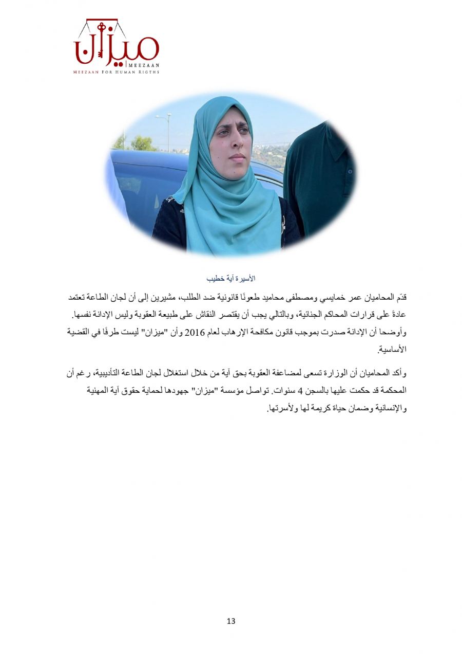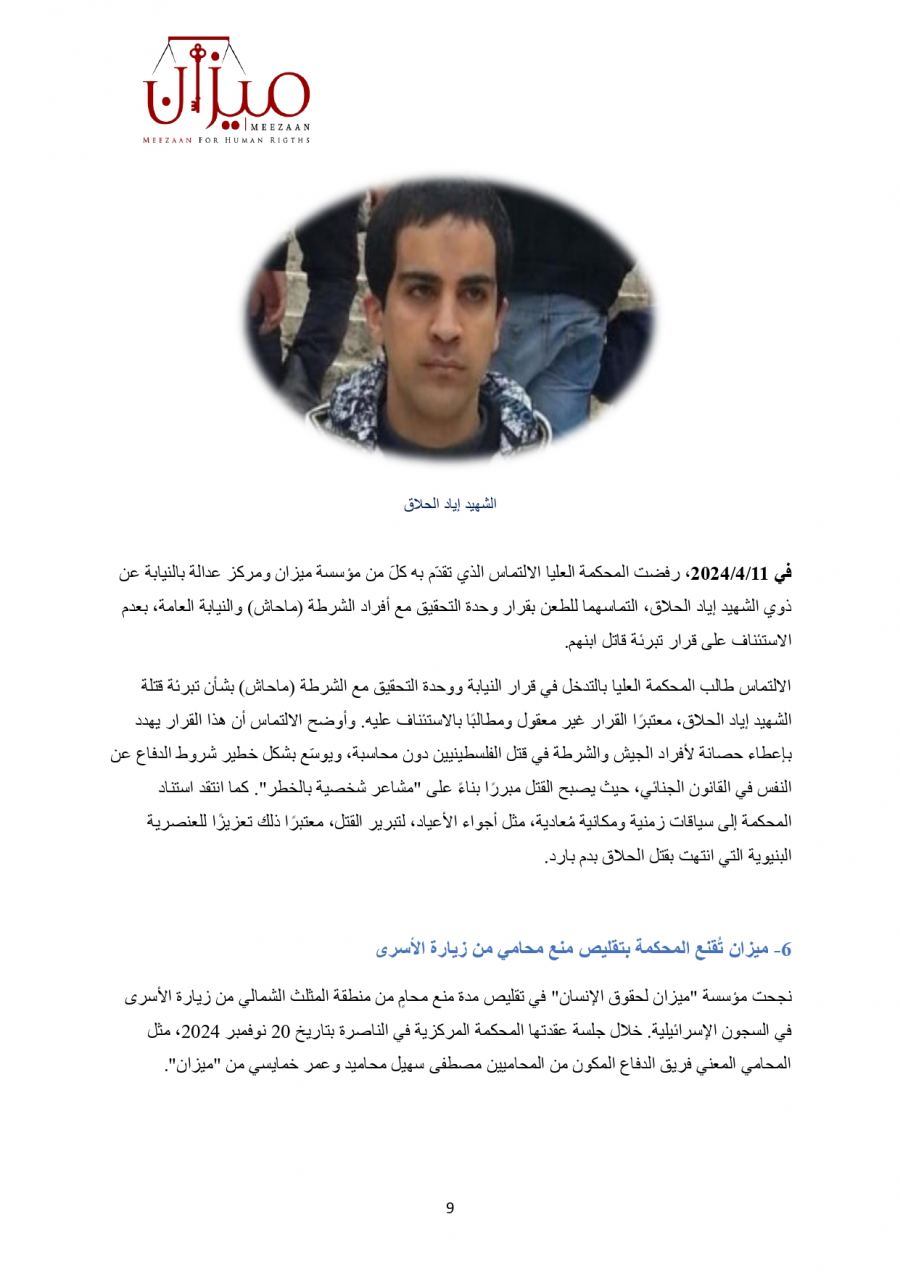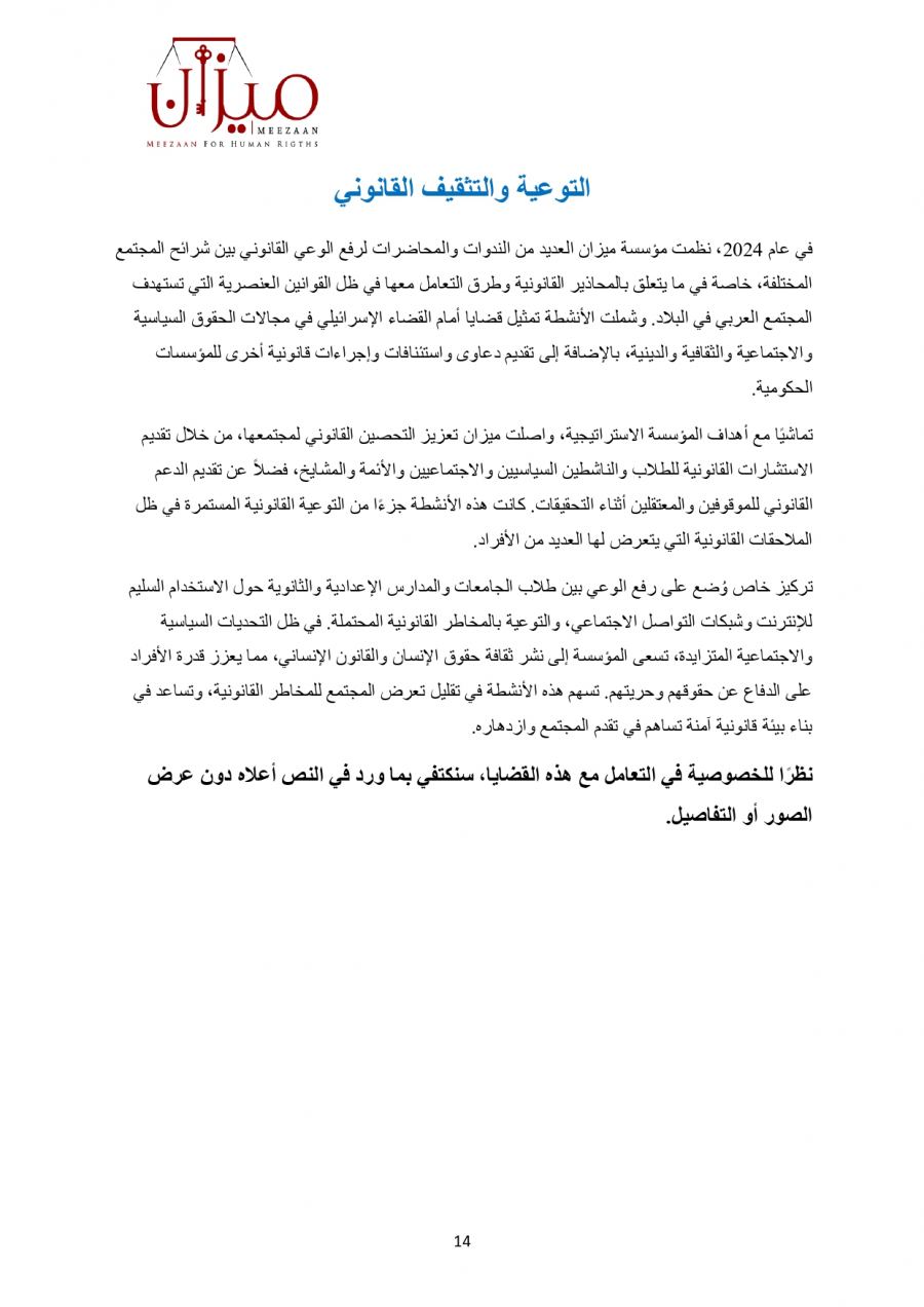 مع التأكيد على أن المؤسسة تابعت العديد من الملفات القضائية خلال العام المنصرم. وكما هو الحال في كل عام، بقيت العديد من القضايا ضمن أروقة المحاكم والقضاء الإسرائيلي دون النشر في وسائل الإعلام، مراعاةً لخصوصية أصحاب هذه الملفات وظروفهم الخاصة.