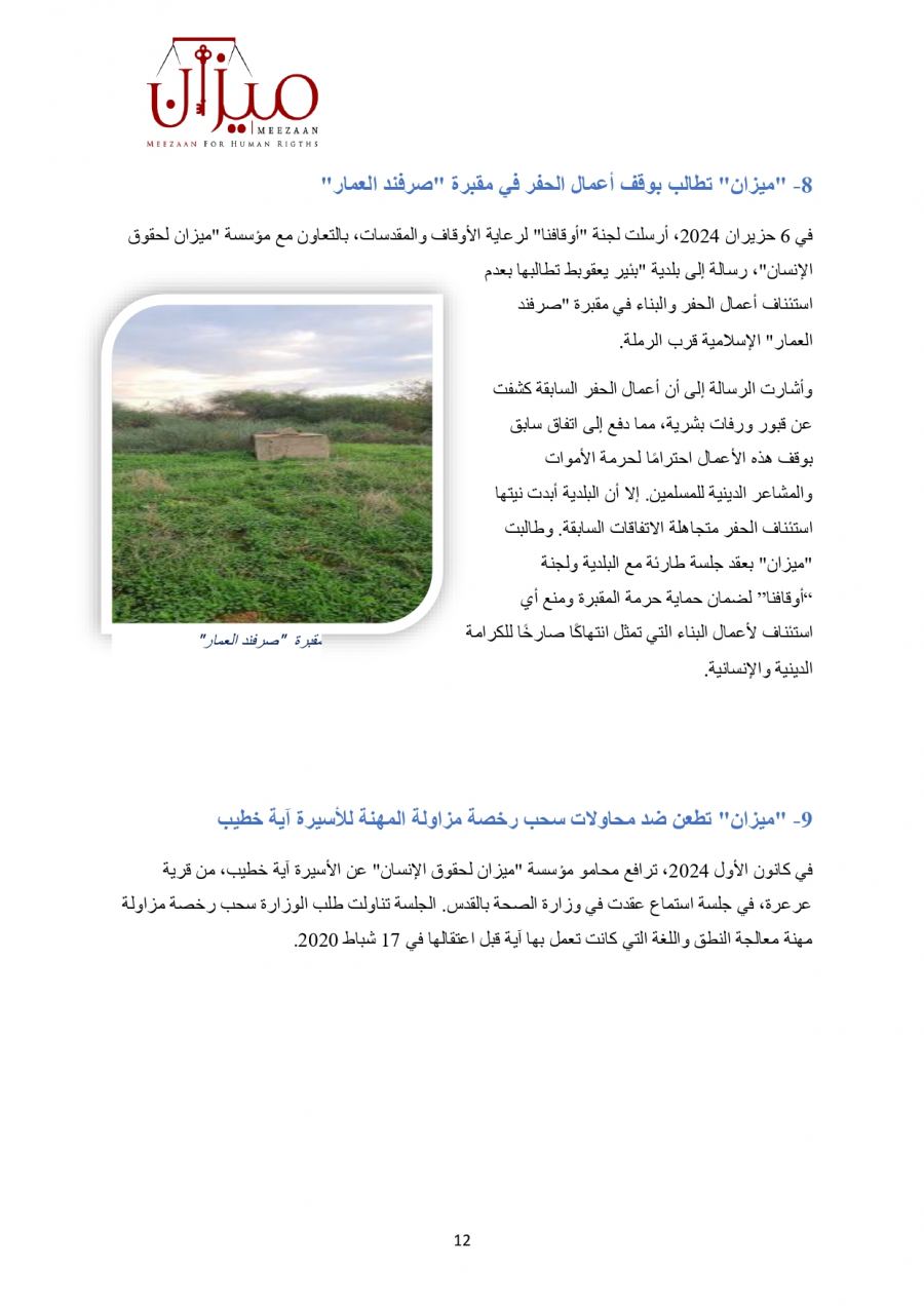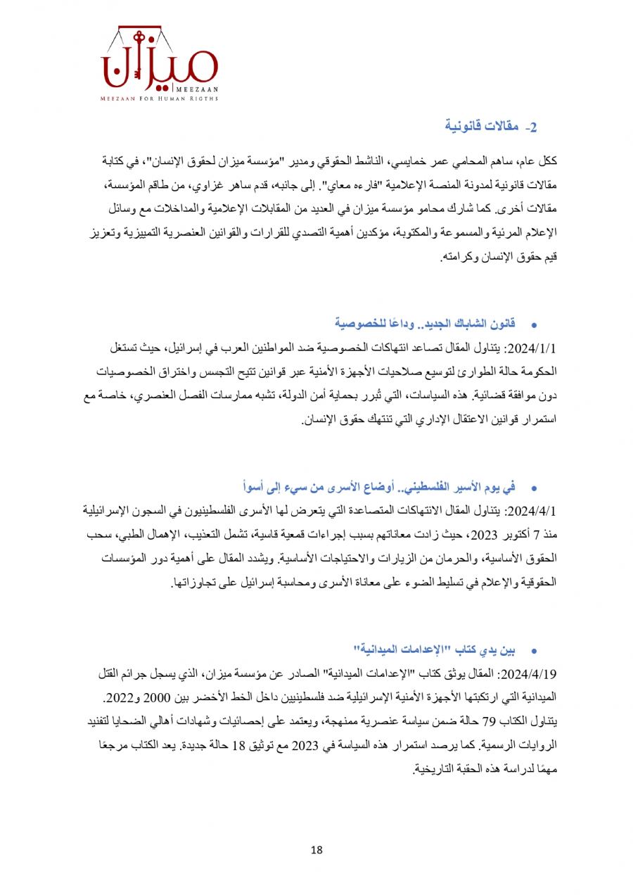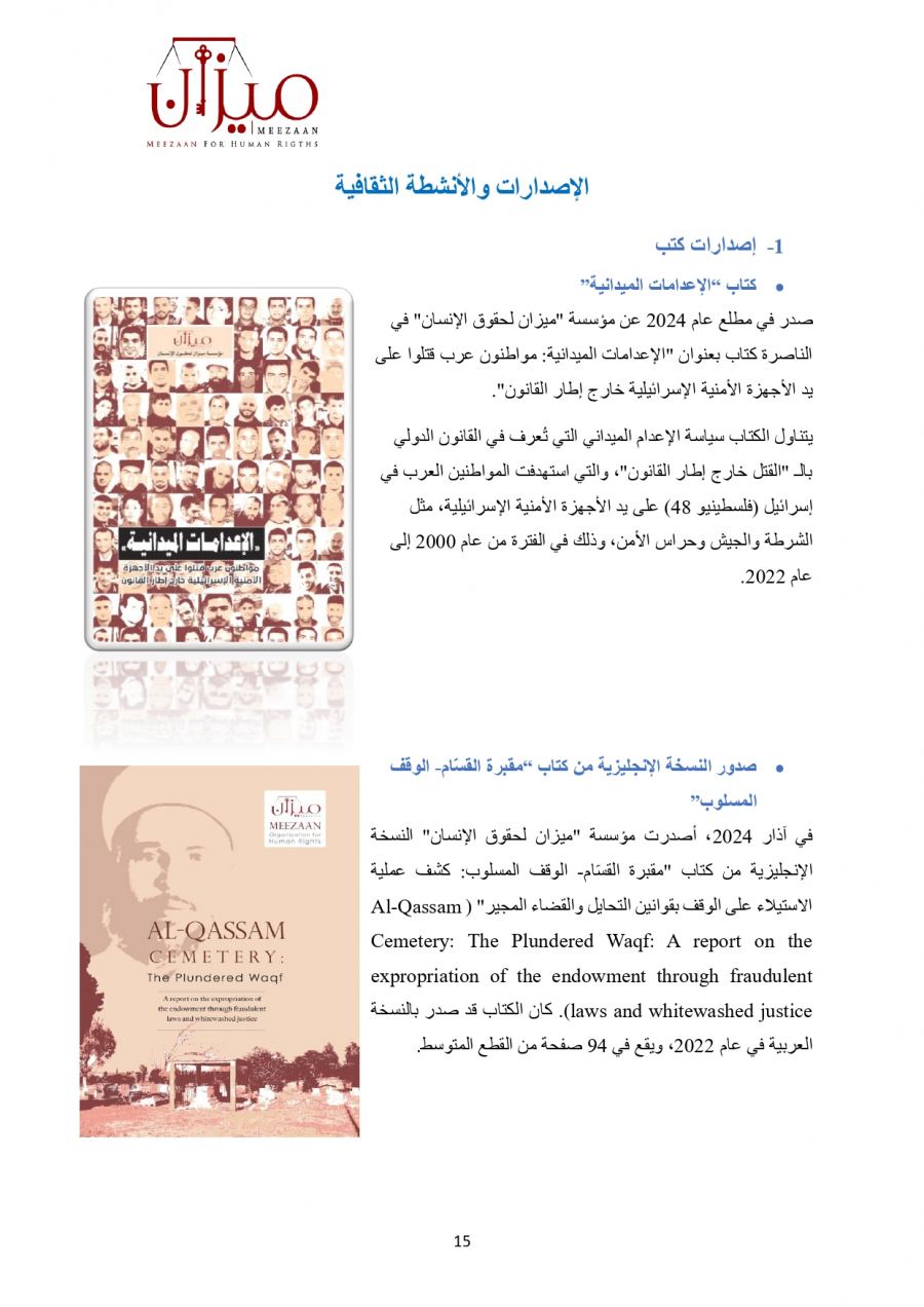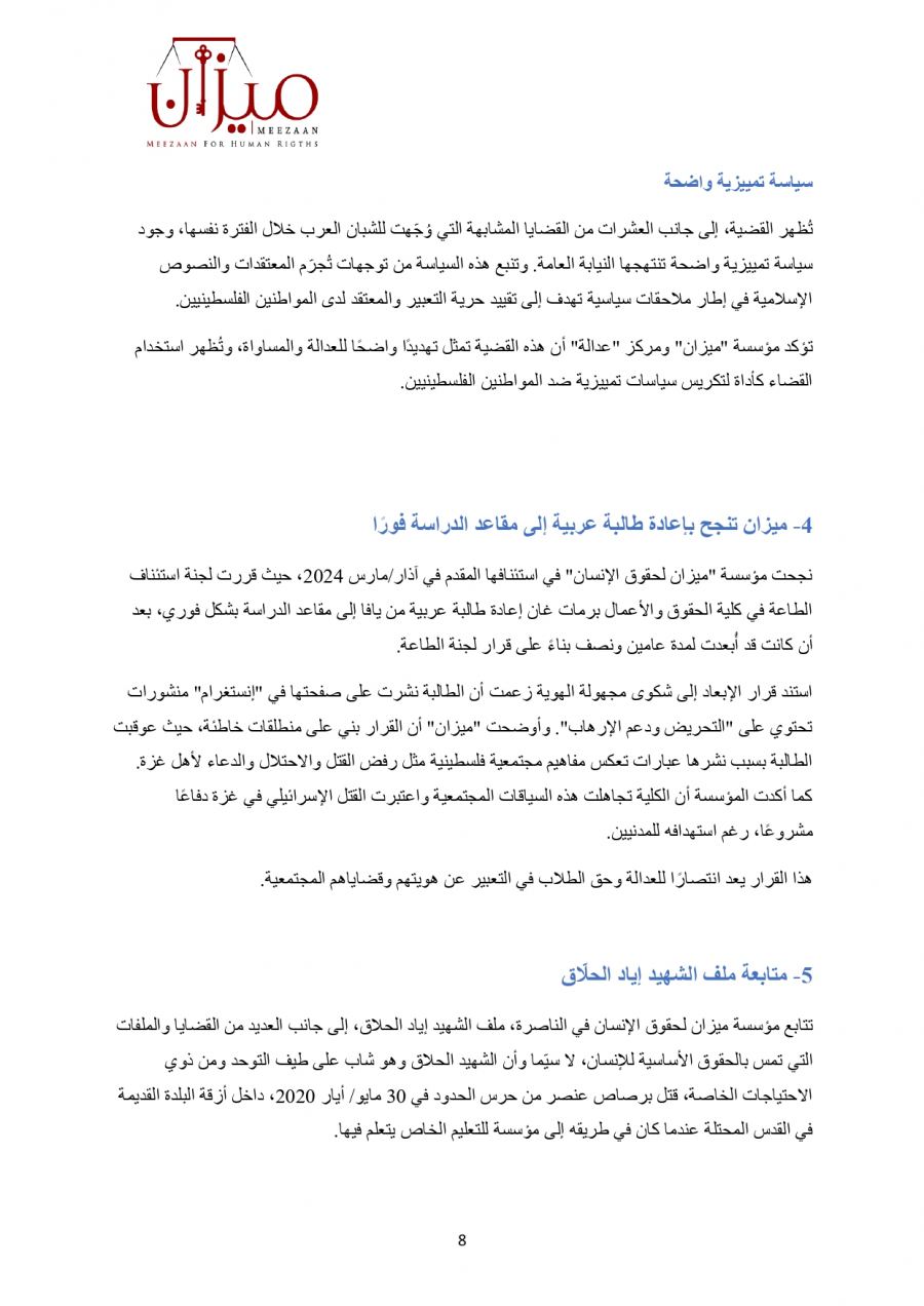 وأشار التقرير إلى متابعة المؤسسة للعديد من القضايا داخل المحاكم الإسرائيلية، مؤكدة دورها كمدافع عن الحقوق السياسية، والاجتماعية، والثقافية، والدينية للفلسطينيين داخل إسرائيل، من خلال تقديم الدعاوى والاستئنافات ومتابعة الإجراءات القانونية أمام المؤسسات الحكومية واللجان المختصة، بما يتماشى مع المعايير الدولية.