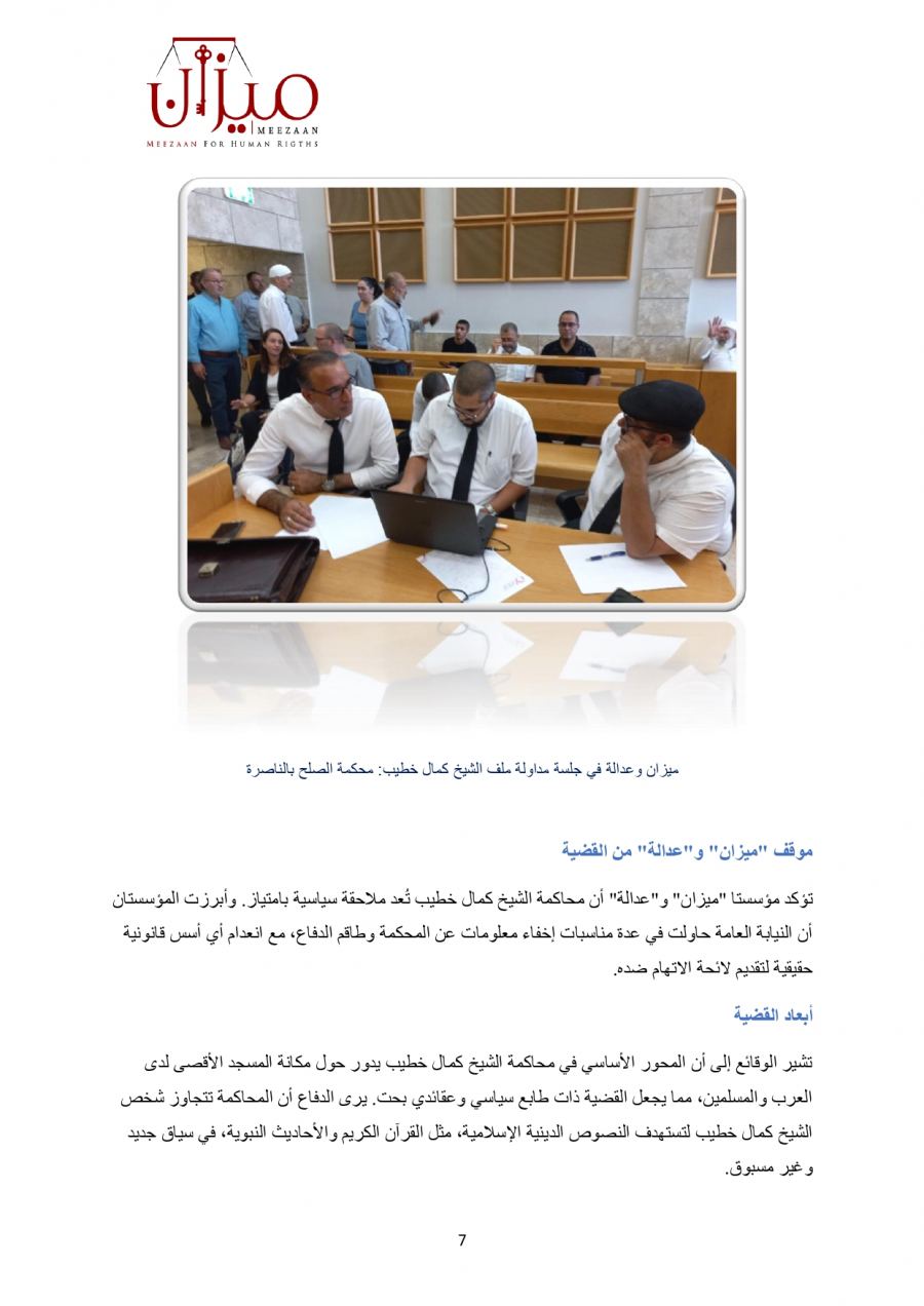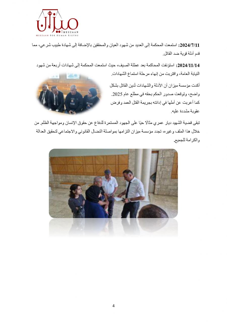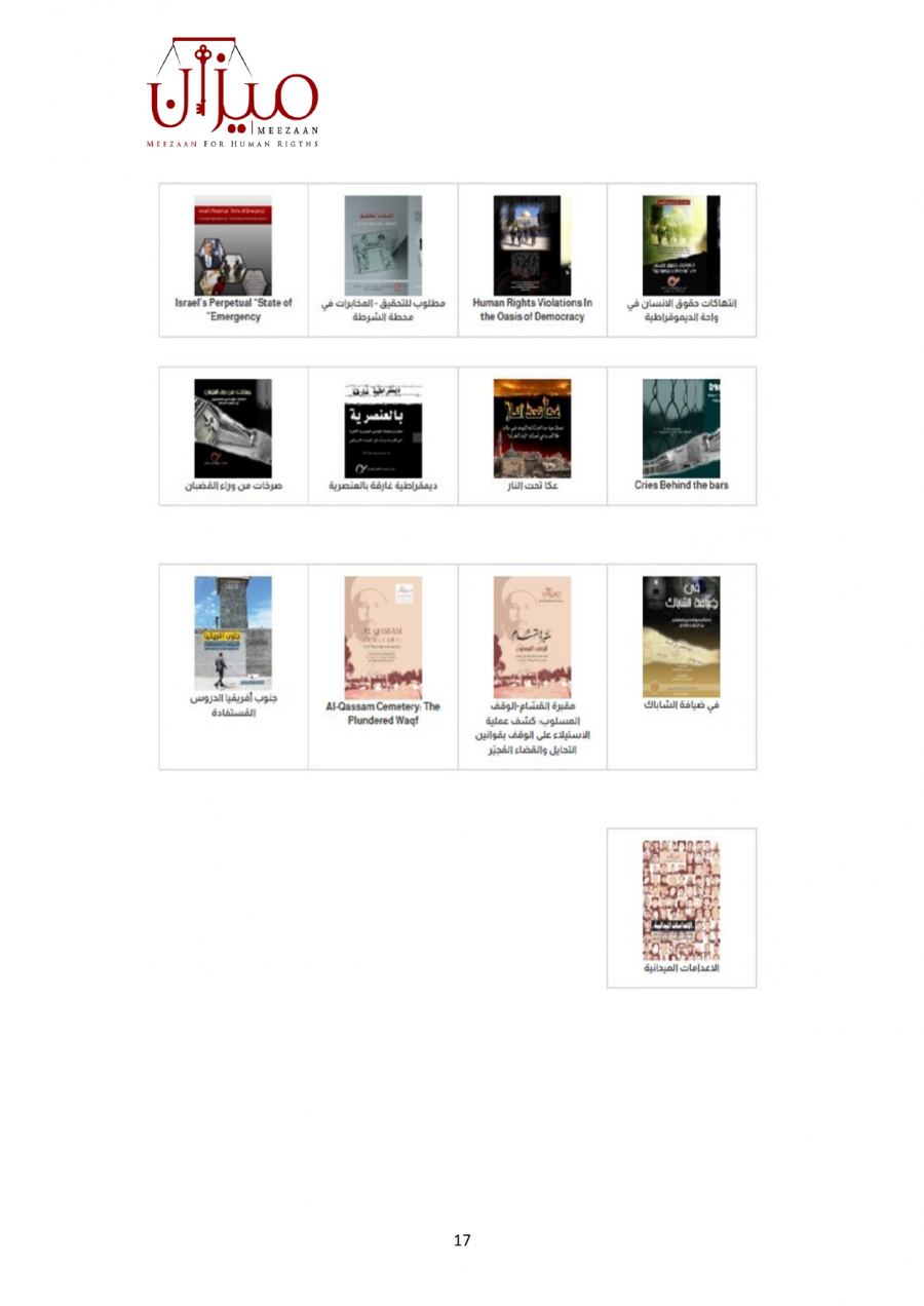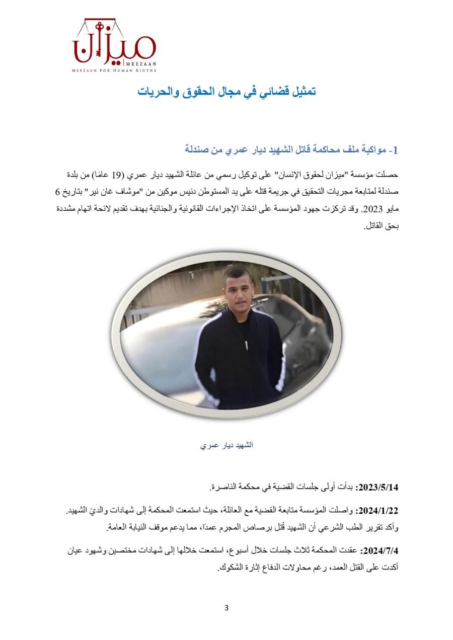 وأشار التقرير إلى متابعة المؤسسة للعديد من القضايا داخل المحاكم الإسرائيلية، مؤكدة دورها كمدافع عن الحقوق السياسية، والاجتماعية، والثقافية، والدينية للفلسطينيين داخل إسرائيل، من خلال تقديم الدعاوى والاستئنافات ومتابعة الإجراءات القانونية أمام المؤسسات الحكومية واللجان المختصة، بما يتماشى مع المعايير الدولية.