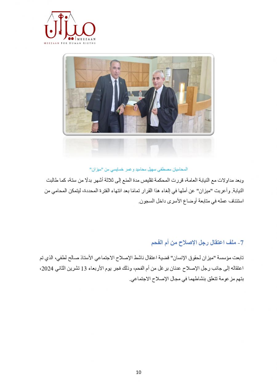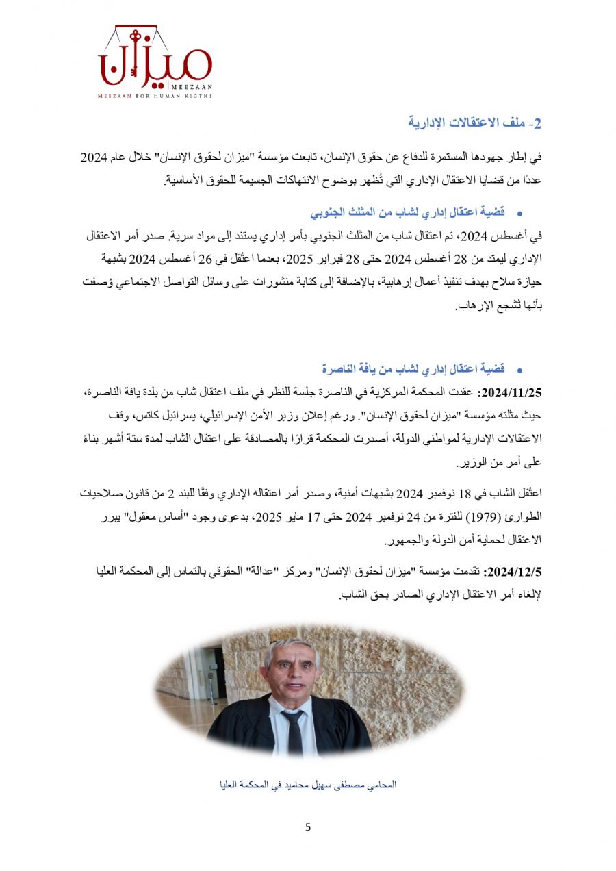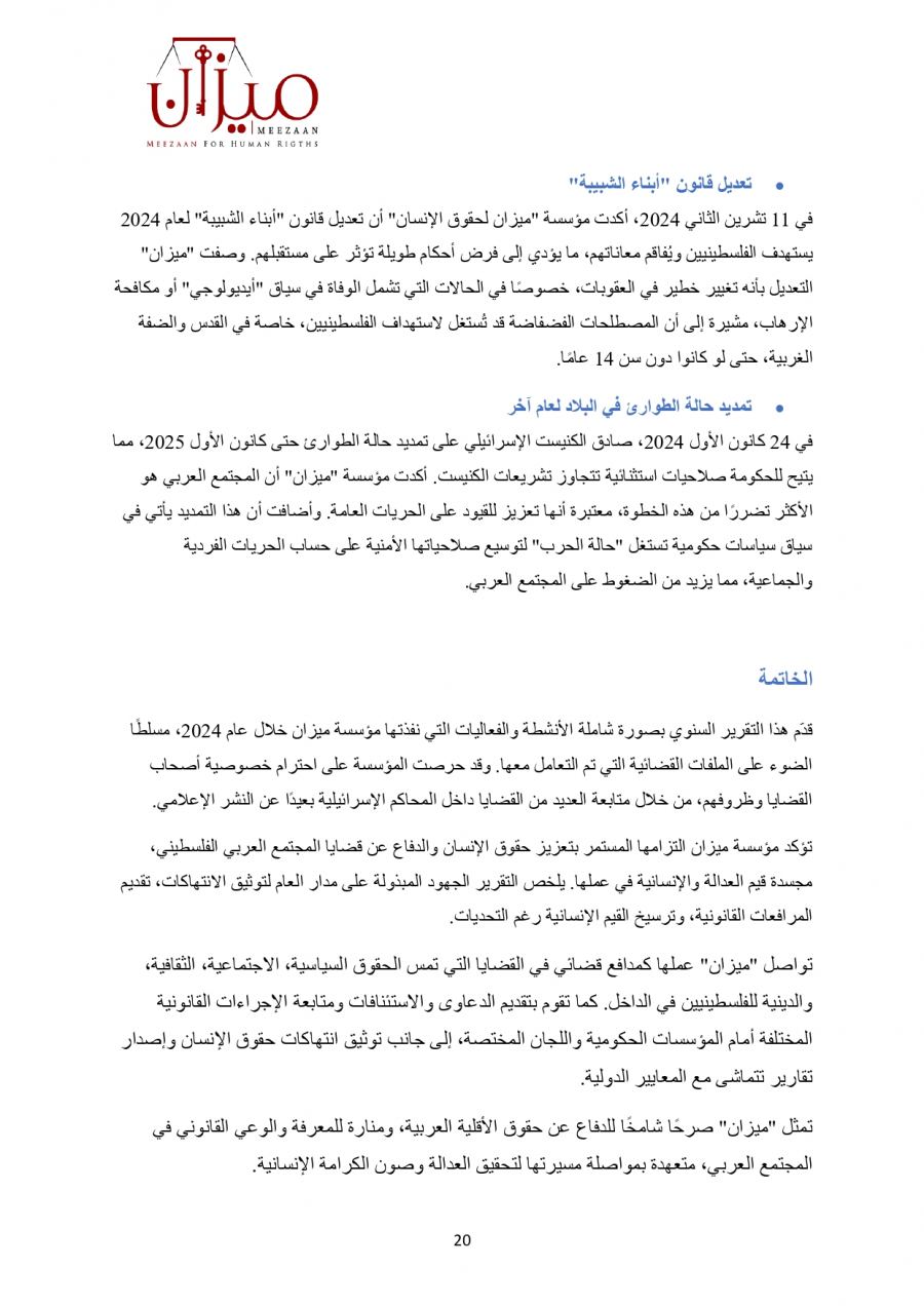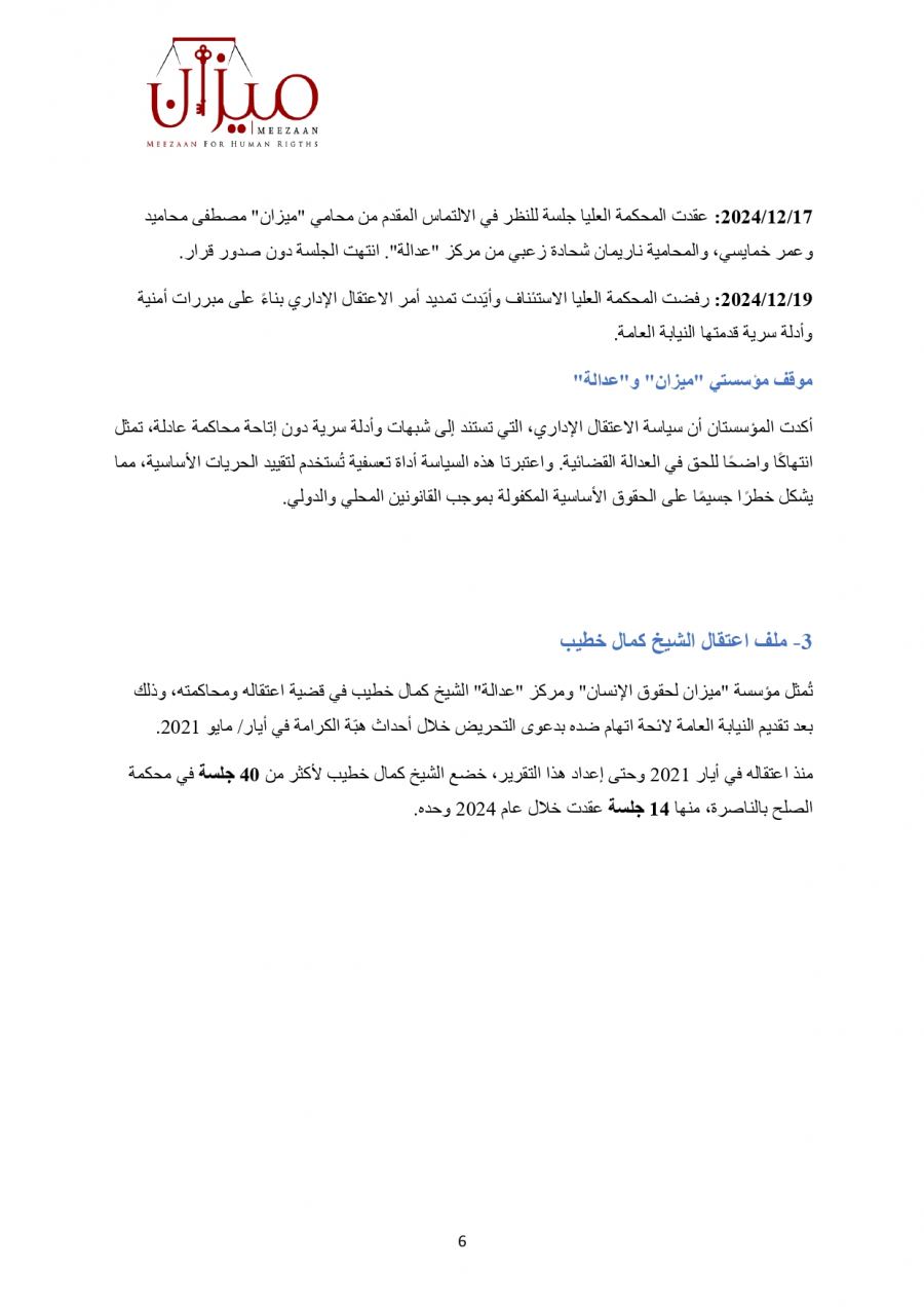 واختتم التقرير بالتأكيد على التزام مؤسسة "ميزان" بمواصلة رسالتها كصرح قانوني ومعرفي يهدف إلى تحقيق العدالة وصون الكرامة الإنسانية، رغم كل التحديات.