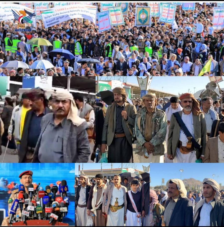 وثمنت الحشود، العمليات النوعية التي نفذتها القوات المسلحة اليمنية في القوة الصاروخية والبحرية وسلاح الجو المسير، ضد قوى العدوان والاستكبار الأمريكي والإسرائيلي والبريطاني.