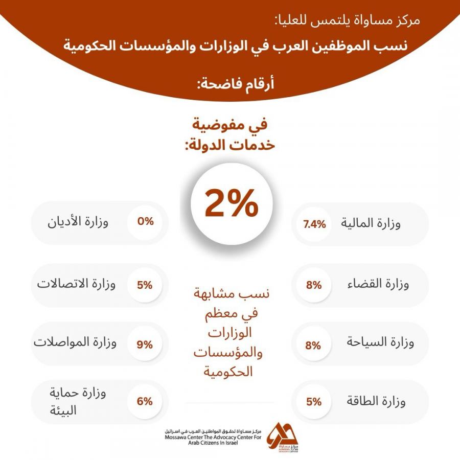 - رغم مرور 24 عامًا على سنّ قانون التمثيل الملائم للعرب في الوزارات الحكومية، إلا أن النسبة العامة للموظفين العرب لا تزال متدنية جدًا. يشير مركز مساواة إلى أن نسبة العرب في المناصب الرفيعة في الوزارات الحكومية لا تتجاوز 0.56%، بينما تصل إلى 8.8% في المناصب المتوسطة. ويُعدّ وزارة الصحة الوحيدة التي اقتربت من تحقيق التمثيل العادل، حيث تبلغ نسبة الموظفين العرب فيها نحو 22%. أما وزارة الاديان، فتسجّل نسبة صفر في المئة من الموظفين العرب.
