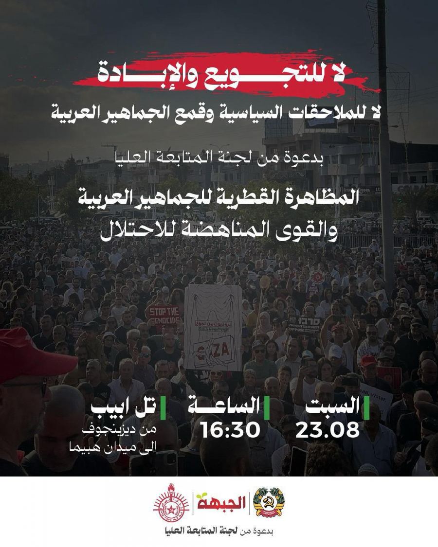 أصدرت الجبهة الديمقراطية للسلام والمساواة والحزب الشيوعي بيانا للدعوة لأوسع مشاركة جماهيرية في المظاهرة ضد حرب التجويع والإبادة التي تنظمها لجنة المتابعة، بعد غد السبت في مدينة تل أبيب.