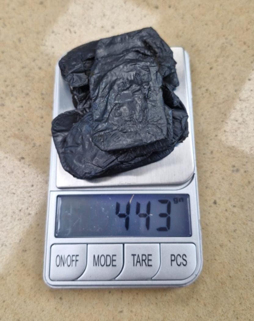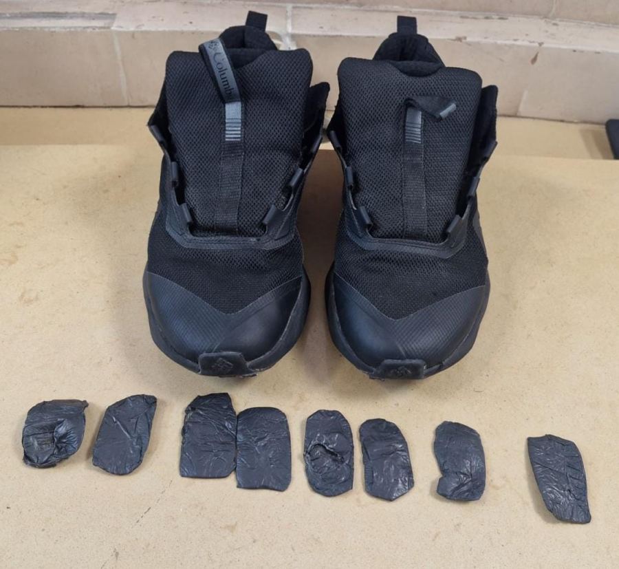 خلال فحص الحذاء من قبل الشرطي المسؤول في المحطّة، اشتبه بوجود جيوب مخفيّة داخل لسانَي الحذاء. وبعد الفحص الدّقيق، ضبط داخل الجيوب على 8 أكياس من مخدّرات الحشيش، بوزن يزيد عن 40 غرامًا.
