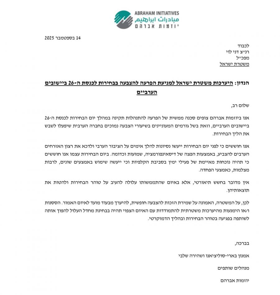 تحذّر جمعية مبادرات إبراهيم من تهديدات حقيقية قد تمسّ بنزاهة الانتخابات المقبلة للكنيست الـ26 في البلدات العربية. إنّ حقّ التصويت بحرية وأمان هو ركيزة أساسية للديمقراطية، لكننا نشهد في هذه الأيام مؤشرات مقلقة تستوجب تحرّكًا فوريًا.