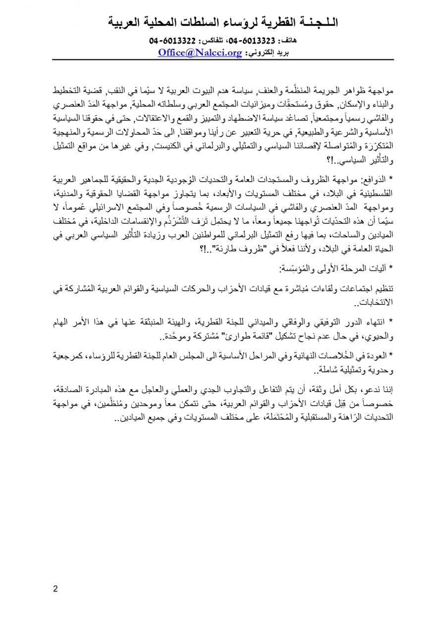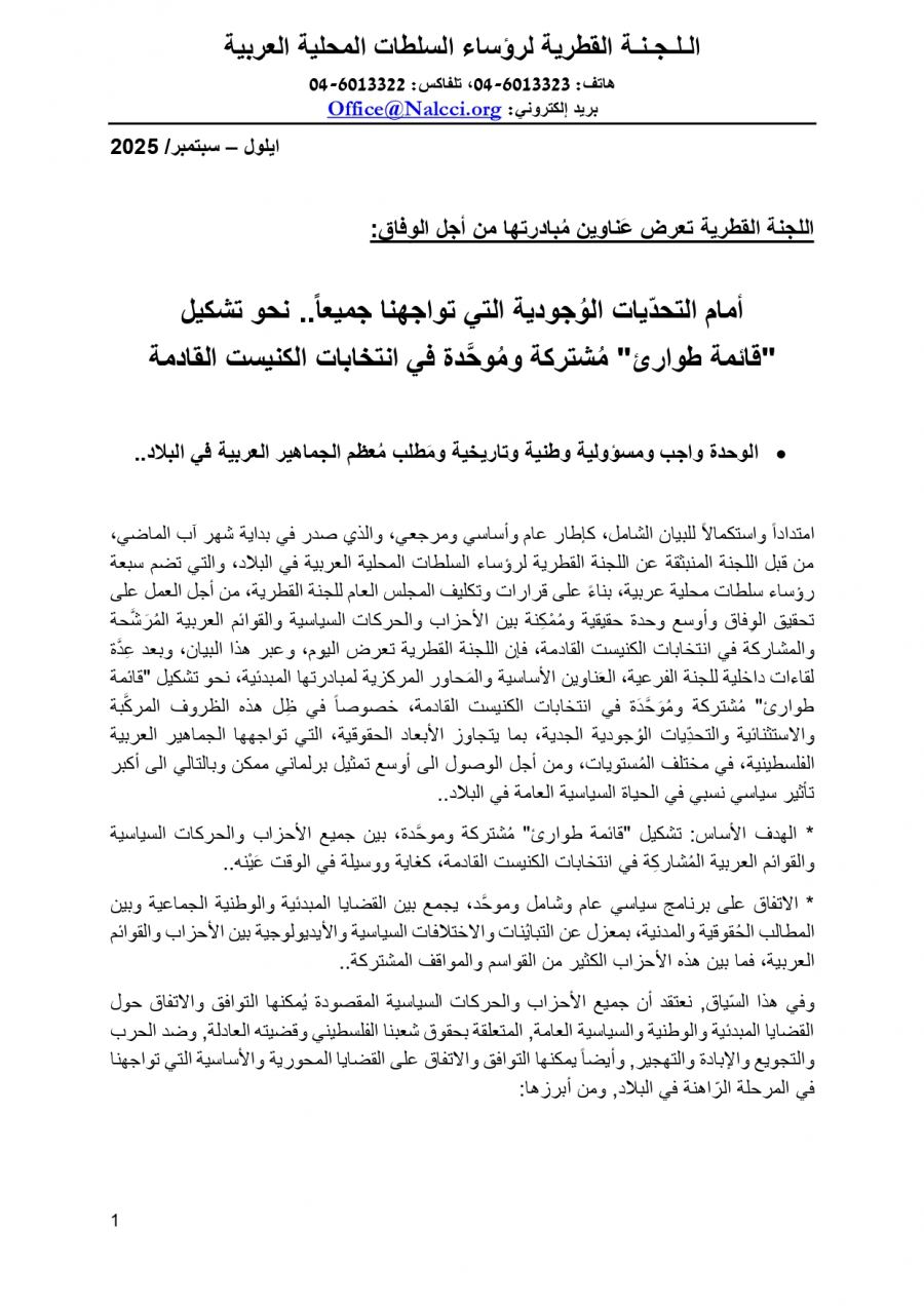امتداداً واستكمالاً للبيان الشامل، كإطار عام وأساسي ومرجعي، والذي صدر في بداية شهر آب الماضي، من قبل اللجنة المنبثقة عن اللجنة القطرية لرؤساء السلطات المحلية العربية في البلاد، والتي تضم سبعة رؤساء سلطات محلية عربية، بناءً على قرارات وتكليف المجلس العام للجنة القطرية، من أجل العمل على تحقيق الوِفاق وأوسع وحدة حقيقية ومُمْكِنة بين الأحزاب والحركات السياسية والقوائم العربية المُرَشَّحة والمشاركة في انتخابات الكنيست القادمة، فإن اللجنة القطرية تعرض اليوم، وعبر هذا البيان، وبعد عِدَّة لقاءات داخلية للجنة الفرعية، العَناوين الأساسية والمَحاور المركزية لمبادرتها المبدئية، نحو تشكيل "قائمة طوارئ" مُشتركة ومُوَحَّدَة في انتخابات الكنيست القادمة، خصوصاً في ظِل هذه الظروف المركَّبة والاستثنائية والتحدِّيات الوُجودية الجدية، بما يتجاوز الأبعاد الحقوقية، التي تواجهها الجماهير العربية الفلسطينية، في مختلف المُستويات، ومن أجل الوصول الى أوسع تمثيل برلماني ممكن وبالتالي الى أكبر تأثير سياسي نسبي في الحياة السياسية العامة في البلاد..