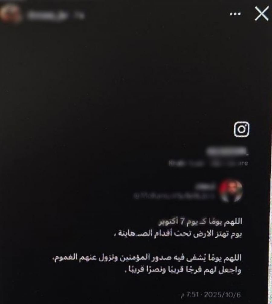 من خلال الرصد السريع لمركز المراقبة والوعي، تم اكتشاف منشور آخر نشره المشتبه قبل عدة أشهر، قال فيه: "يا الله، الأرض أصبحت ضيقة ومليئة بأنين المظلومين البائسين، وليس لهم مؤيد إلا أنت. لذلك، بقوتك التي لا تُقهَر وبجبروتك التي لا تُوقف، أرنا قوتك ضد الصهاينة الظالمين والمجرمين، الذين لا يمكن صدهم أو ردهم أو إيقافهم".
