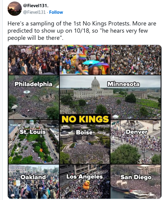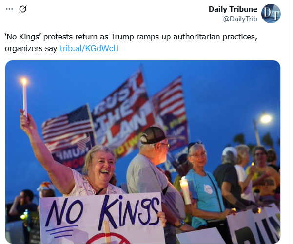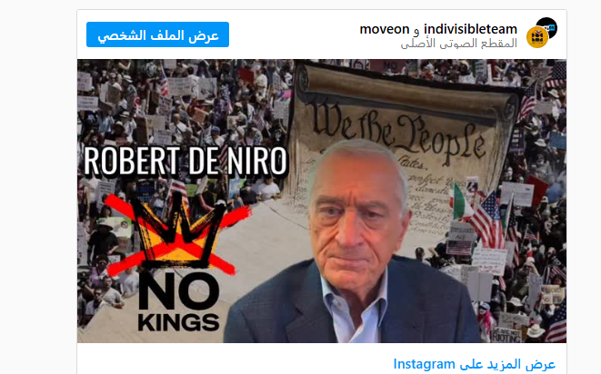وتابع: "الآن، لدينا من يسعى للحكم ويريد انتزاعه: الملك دونالد الأول. ننتفض مجدداً هذه المرة، رافعين أصواتنا سلمياً لنعلن: لا للملوك".