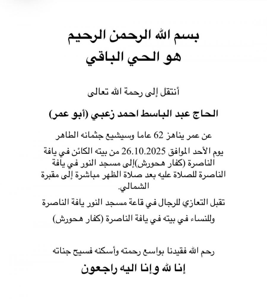 انتقل الى رحمة الله تعالى الحاج عبد الباسط أحمد زعبي ( أبو عمر ) عن عمر ناهز الـ 62 عاما ، وسيشيع جثمانه الطاهر غدا الأحد عند صلاة الظهر من بيته الكائن في يافة الناصرة ( كفارهحورش) للصلاة عليه في مسجد النور