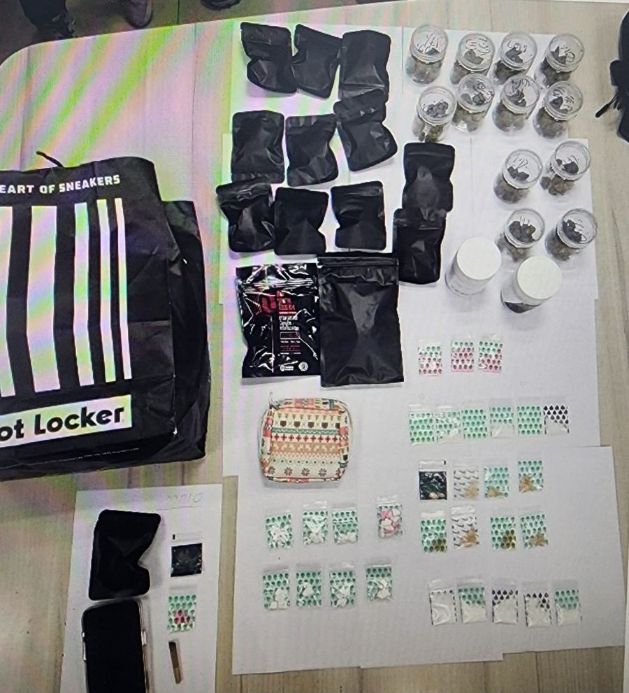14 علبة تحتوي على مادة يشتبه بأنها مخدر من نوع الماريجوانا بوزن إجمالي نحو 140 غرام، 13 كيساً تحتوي على مواد يشتبه بأنها مخدر من نوع الماريجوانا بوزن إجمالي نحو 158 غرام، 7 أكياس تحتوي على مادة يشتبه بأنها مخدر من نوع الكوكايين بوزن نحو 9 غرام، 10 أكياس تحتوي على مادة يشتبه بأنها مخدر من نوع دكتور بوزن إجمالي نحو 15 غرام، 3 أكياس تحتوي على مادة يشتبه بأنها مخدر من نوع دوسة بوزن إجمالي نحو 3 غرام، 8 أكياس تحتوي على مادة يشتبه بأنها مخدر من نوع MD بوزن إجمالي نحو 10 غرام، و13 حبة إكستازي.