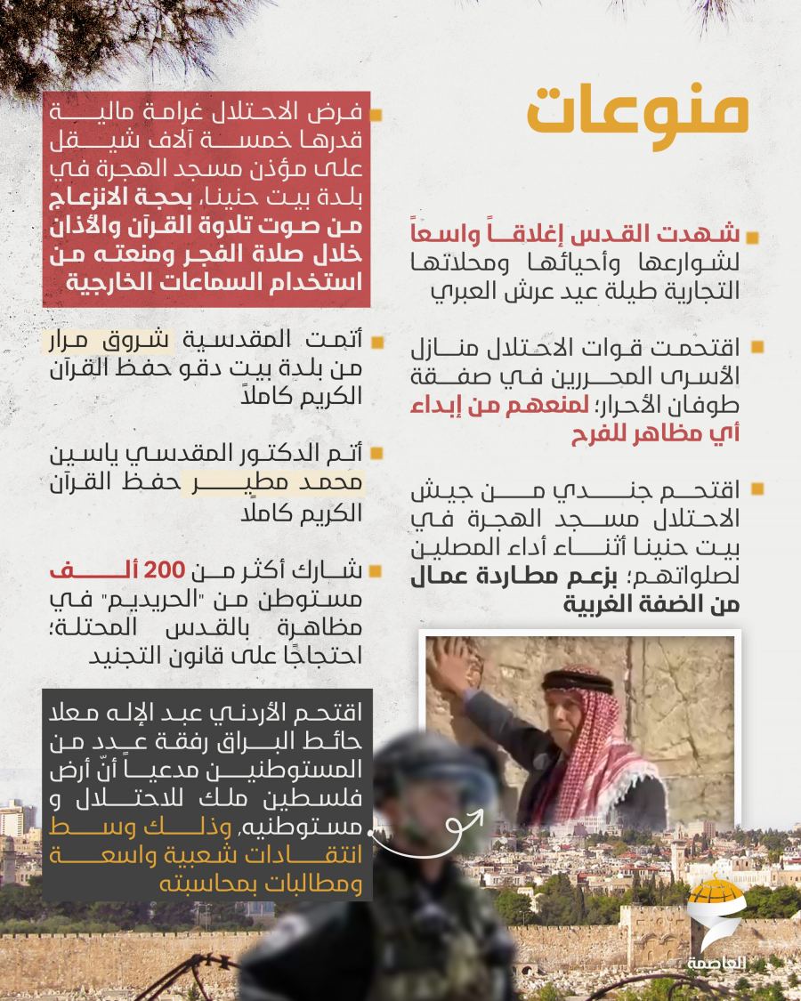 ويعكس هذا التصعيد، بحسب مراقبين، سياسة "إسرائيلية" منهجية لتكريس السيطرة على القدس وتغيير طابعها الديمغرافي، في وقت يواصل فيه السكان المقدسيون التمسك بحقهم في أرضهم ومقدساتهم رغم ما يتعرضون له من تضييق واعتداءات متواصلة.