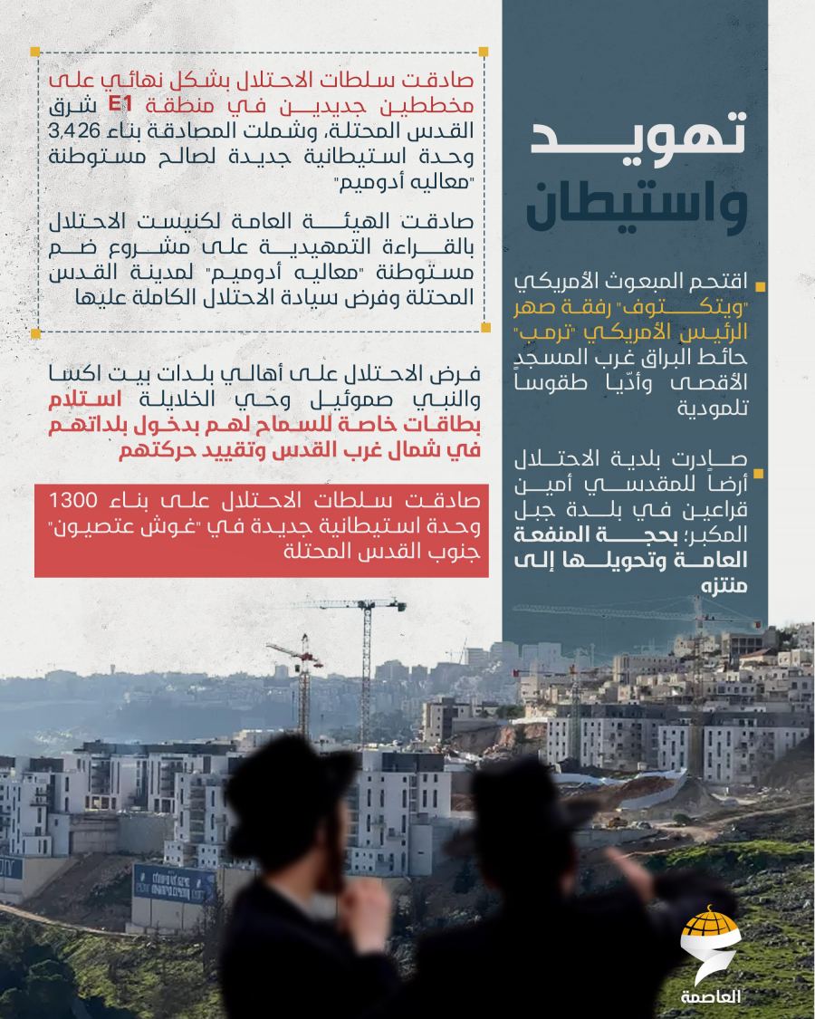 وعلى صعيد الاستيطان، صادقت السلطات الإسرائيلية على مخططين جديدين في منطقة E1 شرق القدس لبناء 3,426 وحدة استيطانية لصالح مستوطنة معاليه أدوميم، كما أقرّ الكنيست بالقراءة التمهيدية مشروع قانون ضم المستوطنة وفرض السيادة الإسرائيلية عليها. وتمت المصادقة كذلك على بناء 1,300 وحدة استيطانية جديدة في مجمع غوش عتصيون جنوب القدس.