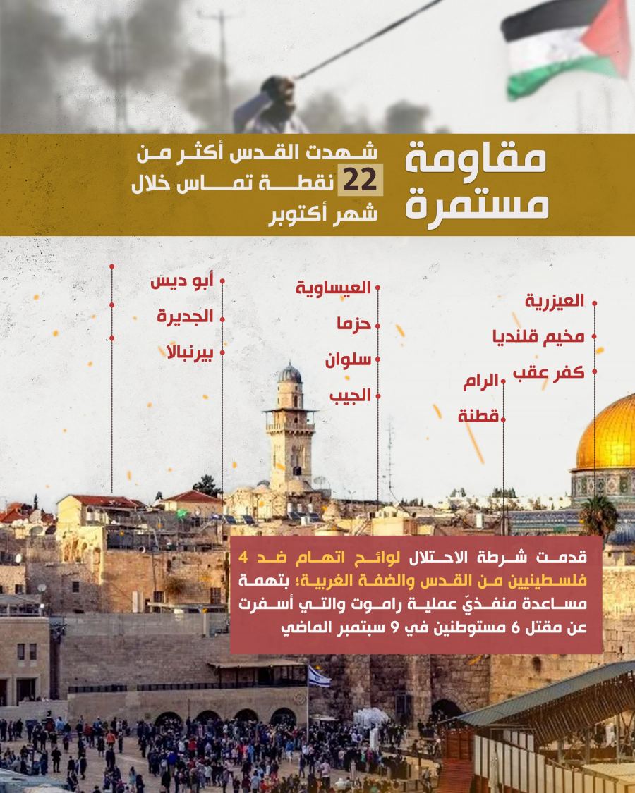 وسجلت القدس أكثر من 22 نقطة اشتباك خلال الشهر في مناطق العيزرية ومخيم قلنديا وكفر عقب والرام وقطنة والعيساوية وحزما وسلوان وأبو ديس وغيرها، فيما قدمت شرطة الاحتلال لوائح اتهام ضد أربعة فلسطينيين بتهمة مساعدة منفذي عملية راموت التي أسفرت عن مقتل ستة مستوطنين في سبتمبر الماضي.
