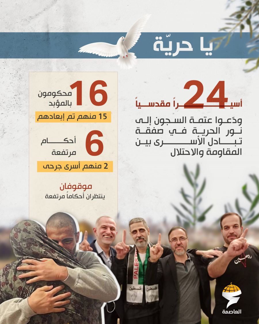 وفي المقابل، أفرج عن 24 أسيراً مقدسياً ضمن صفقة "طوفان الأحرار"، بينهم 16 محكوماً بالمؤبد.