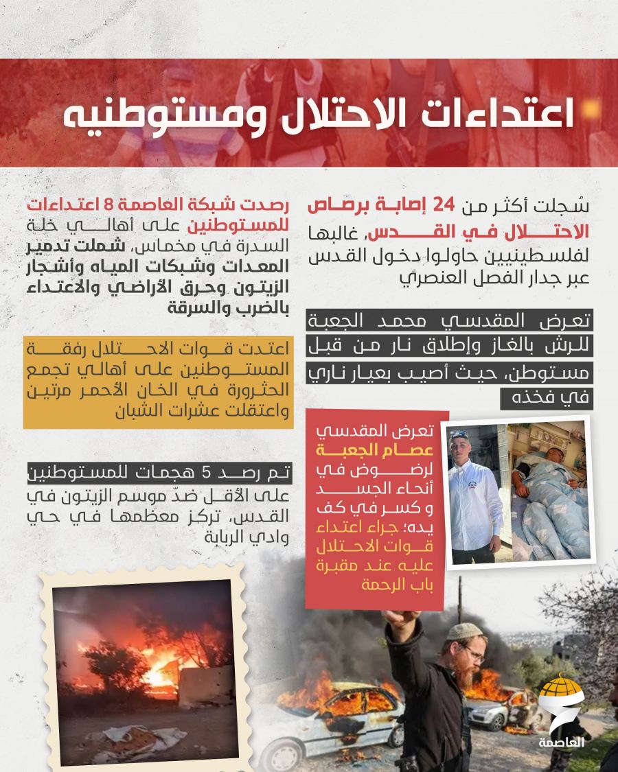ورصد التقرير أكثر من 24 إصابة برصاص الاحتلال في صفوف فلسطينيين حاولوا اجتياز الجدار، إضافة إلى ثمانية اعتداءات شنها مستوطنون على أهالي خلة السدرة في مخماس، وخمس هجمات استهدفت موسم الزيتون في حي وادي الربابة.