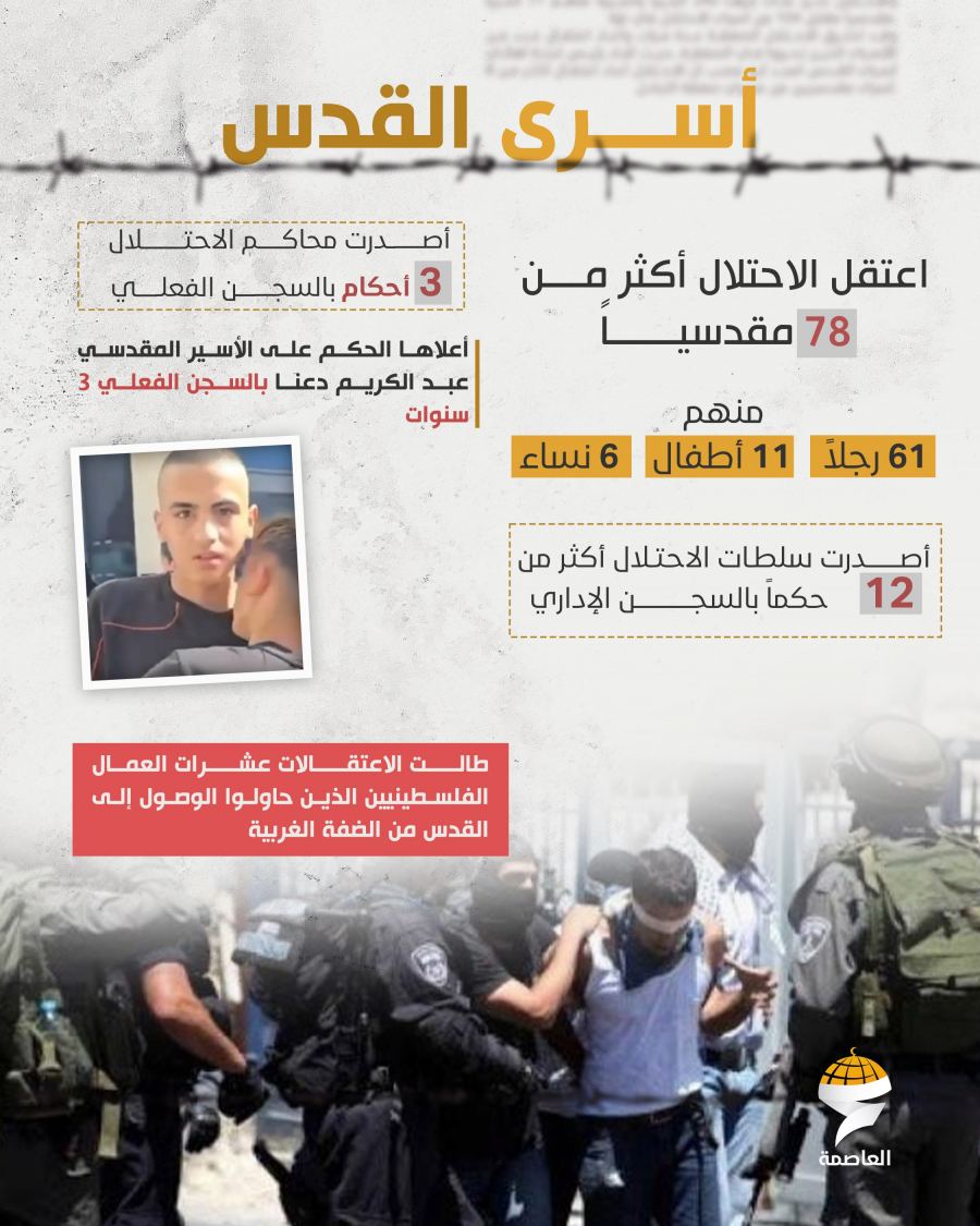 وفي ملف الاعتقالات، وثقت شبكة العاصمة في تقريرها اعتقال 78 مقدسياً، بينهم 61 رجلاً و6 نساء و11 طفلاً، إضافة إلى عشرات العمال الذين حاولوا دخول المدينة من الضفة الغربية. كما أصدرت سلطات الاحتلال 12 حكماً بالسجن الإداري وثلاثة أحكام بالسجن الفعلي.