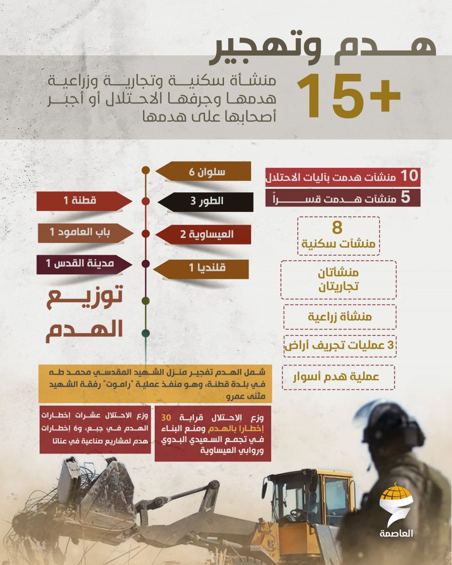 وفي سياق موازٍ، نفّذ الاحتلال أكثر من 15 عملية هدم وجرف طالت منازل ومنشآت سكنية وتجارية وزراعية، بينها عشر هدمت بآلياته وخمس هدمت قسراً من قبل أصحابها. كما فجّر منزل الشهيد محمد طه في بلدة قطنة، منفذ عملية راموت مع الشهيد مثنى عمرو. ووزعت السلطات الإسرائيلية عشرات إخطارات الهدم في جبع وعناتا وتجمع السعيدي وروابي العيساوية، في إطار سياسة تستهدف التوسع الاستيطاني وتقليص الوجود الفلسطيني.