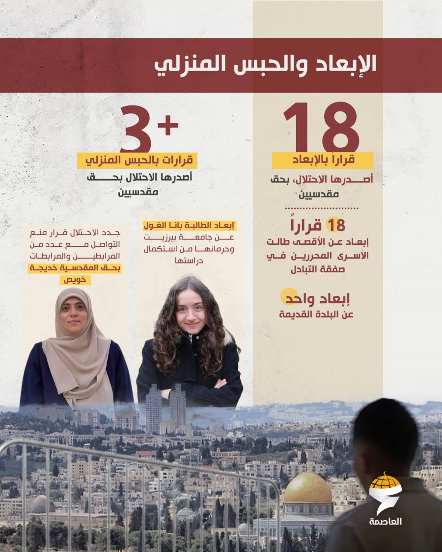 كما أصدر الاحتلال ثلاثة قرارات بالحبس المنزلي وأكثر من 18 قراراً بالإبعاد، منها 16 عن المسجد الأقصى طالت عدداً من الأسرى المحررين، إلى جانب إبعاد الطالبة بانا الغول عن جامعة بيرزيت، وتجديد قرار منع التواصل بحق المرابطة خديجة خويص.