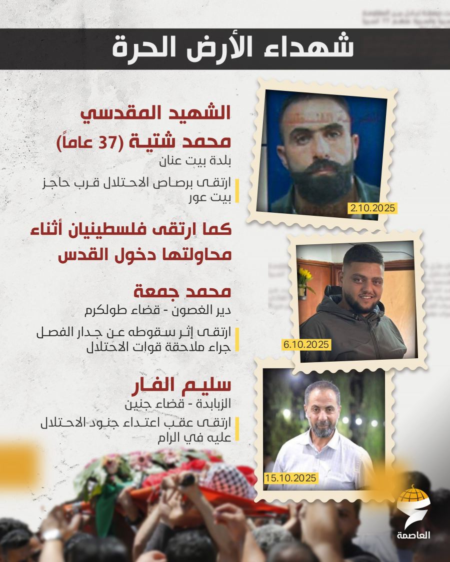 ووفقاً ما رصدته شبكة العاصمة الإخبارية، فقد استُشهد المقدسي محمد شتية (37 عاماً) من بلدة بيت عنان بعد إطلاق النار عليه قرب حاجز بيت عور في الثاني من أكتوبر، كما استُشهد العاملان محمد جمعة من طولكرم وسليم الفار من جنين أثناء محاولتهما دخول القدس عبر الجدار الفاصل.