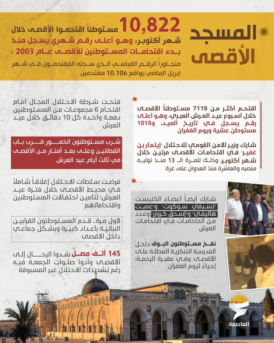 القدس- شبكة العاصمة- شهدت مدينة القدس خلال شهر أكتوبر/تشرين الأول المنصرم تصعيداً غير مسبوق في الانتهاكات "الإسرائيلية"، شمل عمليات اقتحام واسعة للمسجد الأقصى، واعتداءات ضد الفلسطينيين وممتلكاتهم، وهدم منازل واعتقالات طالت العشرات، في ظل سعي الاحتلال لفرض وقائع جديدة في المدينة وتهجير سكانها قسراً.