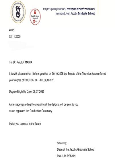 الدكتورة ماريا ماهر قعيق بمناسبة حصولها المشرف على درجة الدكتوراه من معهد التخنيون في العلوم الدقيقة في هندسة المواد والكيمياء.