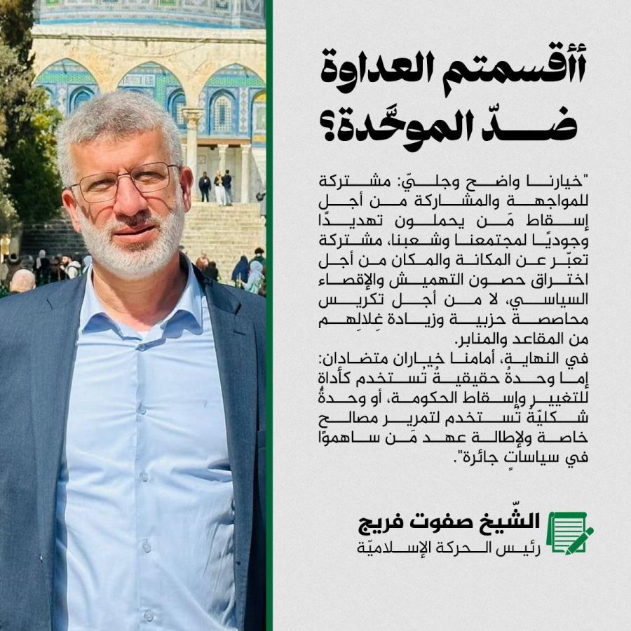 لكنّ الحقيقة أبسط: كثيرون منهم لا يريدون أكثر من مقاعد في الكنيست، ومواقع تأثيرٍ فردية تُبقيهم في دائرة اللعبة القديمة - لعبة التمثيل من داخل مؤسسات دولةٍ لا تزال تسنّ سياساتٍ تمسُّ مجتمعنا في صميم وجوده. وما يُقلقهم بحقّ هو الالتفاف الجماهيري حول الموحَّدة وقادتها، حول مشروعٍ معلنٍ وواضحٍ يتبنّى دوائر انتماءٍ خمسًا لا ينوي الانسلاخ عنها: الإنسانية، والإسلامية، والعربية، والفلسطينية، والمواطنة في دولة إسرائيل. في هذه الدوائر نرى سبل العمل والإصلاح، وبها نرسم طرقًا للمواجهة والتأثير، بعون الله تعالى.