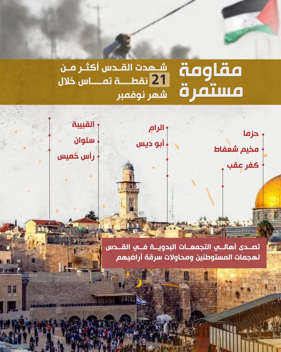 وسجلت الشبكة وقوع أكثر من 21 نقطة تماس مع قوات الاحتلال في مختلف مناطق القدس، أبرزها حزما ومخيم شعفاط وكفر عقب والرام وأبو ديس والقبيبة وسلوان ورأس خميس، كما تصدى أهالي التجمعات البدوية لهجمات المستوطنين ومحاولات الاستيلاء على الأراضي.