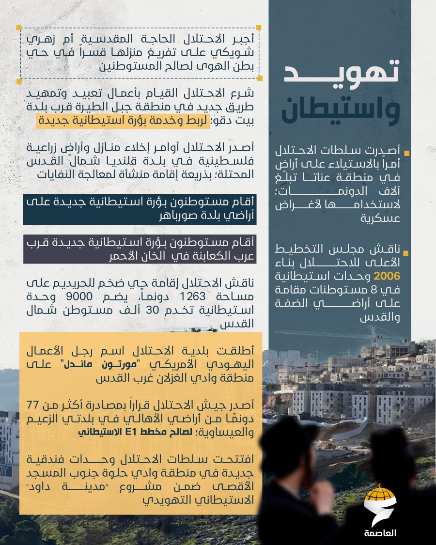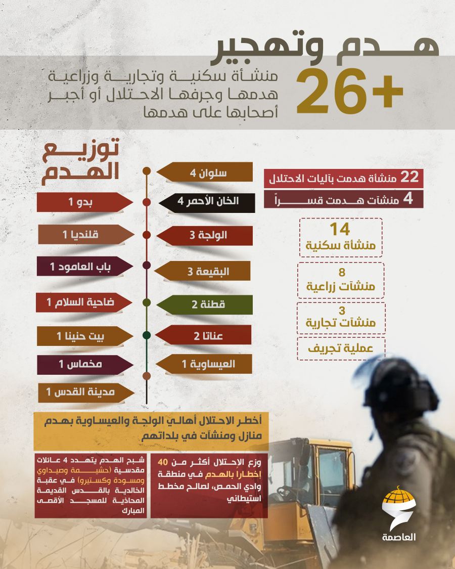 وفي ملف الهدم والتهجير، رصدت شبكة العاصمة هدم وجرف أكثر من 26 منشأة سكنية وتجارية وزراعية، من بينها 22 منشأة هدمت بآليات الاحتلال و4 منشآت هدمت قسرًا، وتركّزت عمليات الهدم في سلوان والخان الأحمر والولجة والبقيعة وقطنة وعناتا والعيساوية وبدو وقلنديا وباب العامود وضاحية السلام وبيت حنينا ومخماس ومدينة القدس.