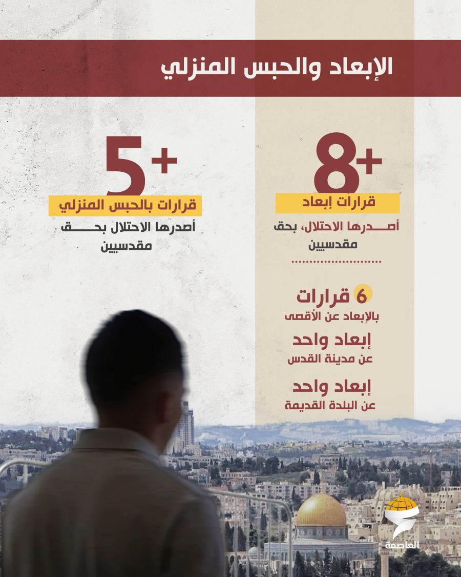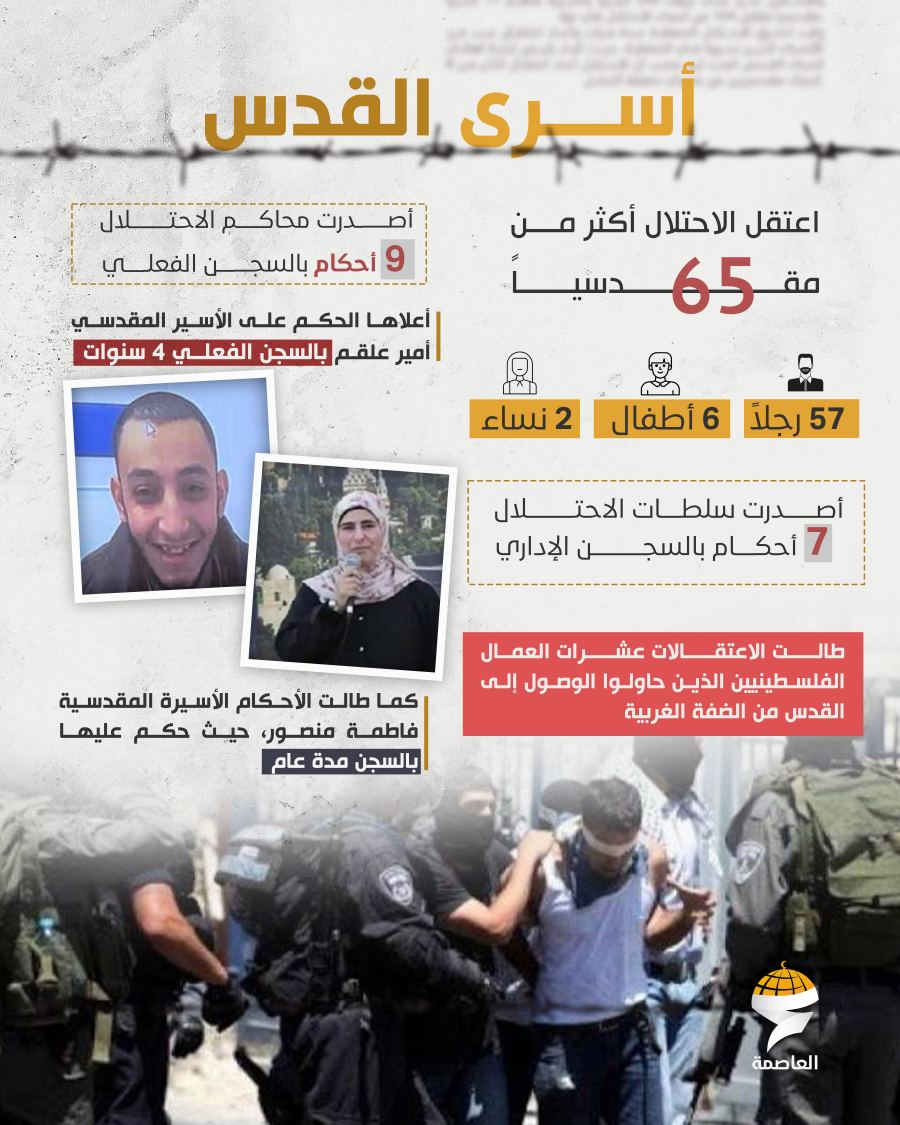 كما اعتقلت قوات الاحتلال أكثر من 64 مقدسيًا بينهم 56 رجلاً وسيدتان و6 أطفال، وأصدرت 7 أوامر اعتقال إداري و9 أحكامًا بالسجن الفعلي بلغ أعلاها 4 سنوات بحق الأسير أمير علقم، إضافة إلى الحكم على الأسيرة فاطمة منصور بالسجن لمدة عام واحد. وشهد الشهر إصدار 4 قرارات بالحبس المنزلي و8 قرارات بالإبعاد، منها 6 عن المسجد الأقصى، إضافة إلى إبعاد عن القدس وآخر عن البلدة القديمة.