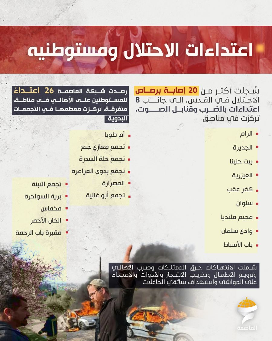 وخلال الشهر، سجلت القدس أكثر من 20 إصابة برصاص الاحتلال و8 اعتداءات بالضرب وقنابل الصوت في مناطق متعددة، إضافة إلى 26 اعتداءً للمستوطنين طالت الأهالي وممتلكاتهم في أحياء وتجمعات متفرقة، وشملت الاعتداءات الحرق والتخريب والاعتداء على المواشي وترويع الأطفال واستهداف سائقي الحافلات.