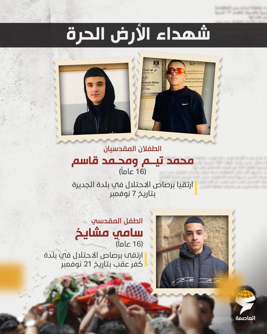 وارتقى خلال شهر نوفمبر ثلاثة أطفال مقدسيين هم محمد تيم ومحمد قاسم (16 عامًا) في بلدة الجديرة بتاريخ 7 نوفمبر، والطفل سامي مشايخ (16 عامًا) في كفر عقب بتاريخ 21 نوفمبر، في استمرار لسياسة استهداف الأطفال والشبان في المدينة.