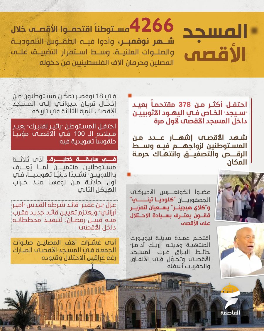 وفي المسجد الأقصى، اقتحم 4266 مستوطنًا باحاته وأدّوا طقوسًا تلمودية وصلوات علنية، وسط حرمان آلاف الفلسطينيين من دخول المسجد، فيما احتفل 378 مقتحمًا بعيد "سيجد" داخل الأقصى لأول مرة. وسُجل إدخال قربان حيواني للمرة الثالثة في تاريخ المسجد، إلى جانب أداء ثلاثة مستوطنين من “اللاويين” نشيدًا تهويديًا داخل الأقصى في سابقة خطيرة. ورغم القيود والعراقيل، شهد المسجد أداء عشرات آلاف المصلين لصلاة الجمعة.