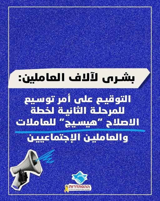تم التوقيع رسمياً على أمر التوسيع للمرحلة الثانية من إصلاح "هيسيج" المتعلق بالعاملات والعاملين الاجتماعيين، حيث يضمن هذا الأمر الذي نشرته وزارة العمل حصول نحو 6,000 من العاملات والعاملين في الخدمات المخصخصة على زيادات الأجور التي أُقرت ضمن الإصلاح الذي قادته الهستدروت ونقابة العاملين الاجتماعيين. ويشمل الإصلاح تحديث الأجر الأساسي بشكل جوهري وفق جدول أجور جديد مع تحديثات إضافية مقررة للعامين 2026 و2027 بالإضافة إلى صرف منحة لمرة واحدة بقيمة 2,700 شيكل.