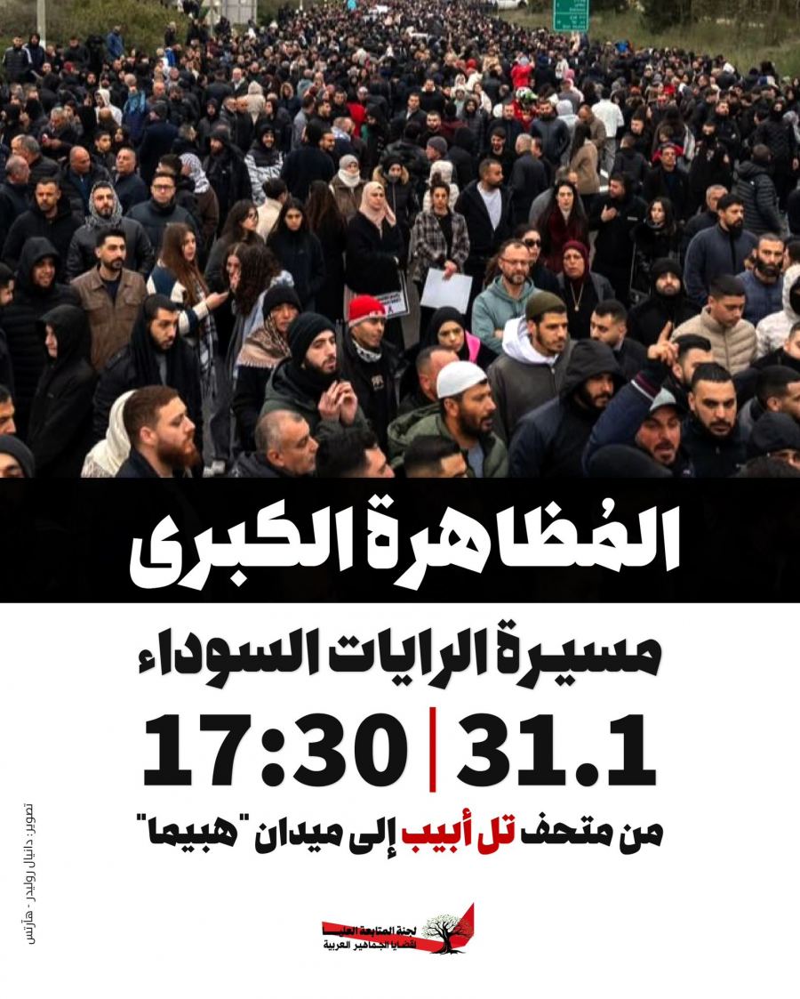 تُعلن لجنة المتابعة العليا للجماهير العربية في البلاد عن تنظيم مظاهرة مركزية تحت عنوان “مسيرة الرايات السوداء ضد الجريمة والعنف والخاوة "في مدينة تل أبيب، وذلك يوم السبت الموافق 31.1.2026. وتنطلق المسيرة عند الساعة الخامسة والنصف مساءً من ساحة متحف تل أبيب باتجاه ميدان “هبيما”.