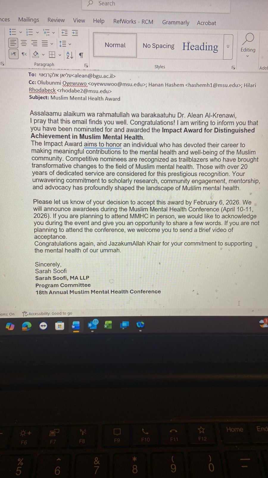 منحت لجنة المؤتمر الثامن عشر للبروفيسور عليان القريناوي جائزة التأثير والمساهمة لعام 2026 تقديرًا لإنجازاته المتميزة في مجال الصحة النفسية للمسلمين. وتعكس هذه الجائزة التزام البروفيسور القريناوي بالبحث العلمي والتطوير المجتمعي في دعم الصحة النفسية والرفاه النفسي للمجتمعات المسلمة، وسعيه المستمر لنشر المعرفة وتقديم حلول عملية للتحديات النفسية والاجتماعية.