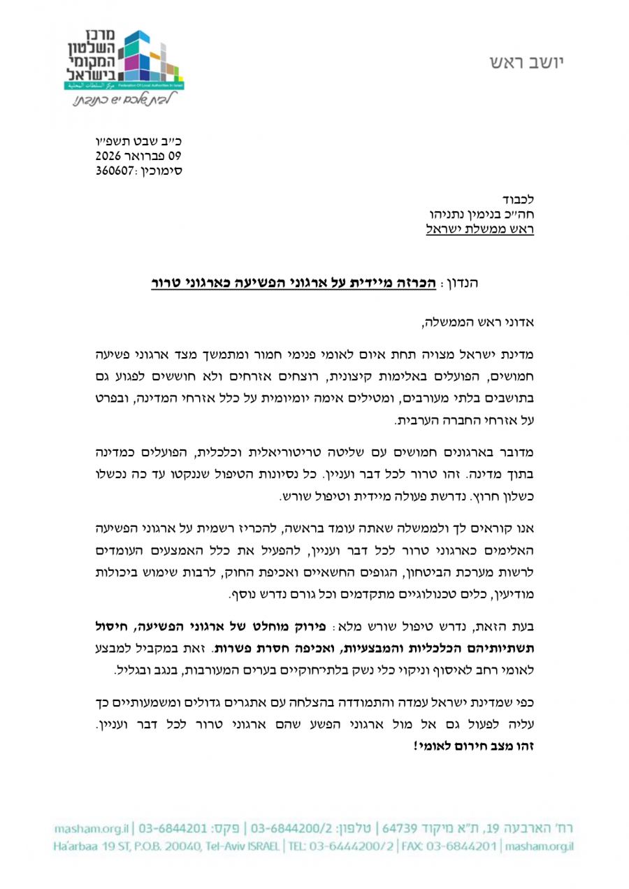 وجاء في نص الرسالة لرئيس الحكومة:"تتعرض دولة إسرائيل لتهديد داخلي خطير ومستمر من قبل منظمات إجرامية مسلحة، تمارس عنفًا مفرطًا، وتقتل المدنيين، ولا تتوانى عن إيذاء السكان الأبرياء، وتُرهب يوميًا جميع مواطني الدولة، ولا سيما مواطني المجتمع العربي. هذه منظمات مسلحة تسيطر على مناطق اقتصادية، وتعمل كدولة داخل الدولة. هذا إرهاب بكل المقاييس. وقد باءت جميع المحاولات للتصدي له حتى الآن بالفشل الذريع. يجب اتخاذ إجراءات فورية ومعالجة الأسباب الجذرية. ندعوكم أنتم والحكومة برئاستكم، إلى إعلان هذه المنظمات الإجرامية العنيفة رسميًا منظمات إرهابية بكل المقاييس، وتفعيل جميع الوسائل المتاحة للجهاز الأمني والهيئات السرية وأجهزة إنفاذ القانون، بما في ذلك استخدام القدرات الاستخباراتية والأدوات التكنولوجية المتقدمة وأي عوامل أخرى ضرورية. في هذا الوقت، يلزم معالجة شاملة للأسباب الجذرية: التفكيك الكامل للمنظمات الإجرامية، والقضاء على بنيتها التحتية الاقتصادية والتشغيلية، وإنفاذ القانون بحزم وبلا هوادة"." "يتزامن هذا مع حملة واسعة النطاق لجمع الأسلحة غير المشروعة في المدن المختلطة وفي الجليل والنقب".وختمت الرسالة:"كما واجهت دولة إسرائيل تحديات جسيمة وتغلبت عليها بنجاح، يجب عليها أيضاً التحرك ضد المنظمات الإجرامية، التي تُعدّ منظمات إرهابية بكل المقاييس.هذه حالة طوارئ وطنية،نطلب تدخلكم لوضع جداول زمنية واضحة لتنفيذ القرارات ومتابعتها مباشرةً.يتوقع الجمهور، الذي يعاني يومياً، قرارات عملية،ويدعمكم الحكم المحلي في كل إجراء، مهما بدا حازماً، للقضاء على هذه الظاهرة".