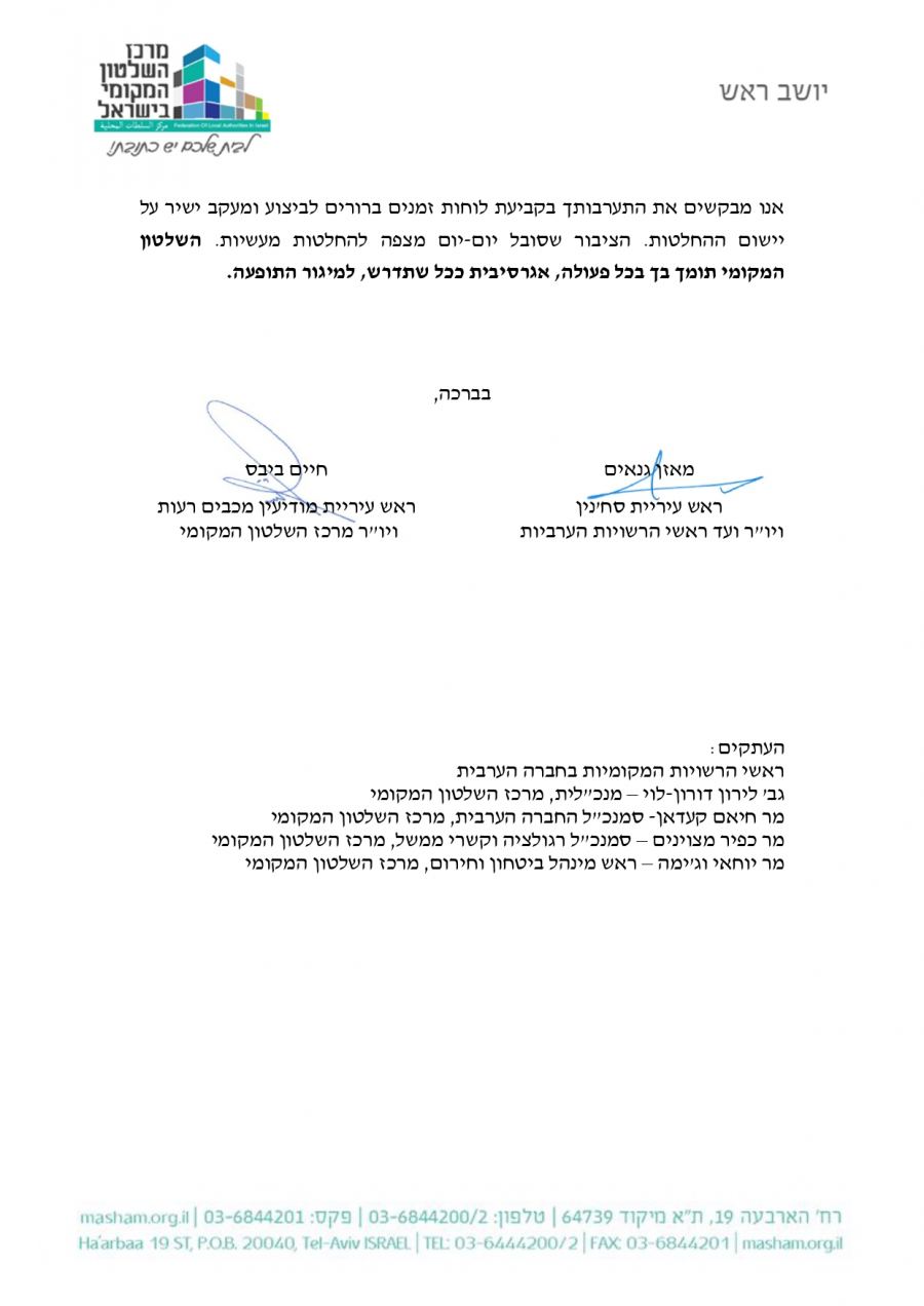 أبرق كل من حاييم بيباس رئيس مركز السلطات المحلية ومازن غنايم رئيس بلدية سخنين ورئيس اللجنة القطرية لرؤساء السلطات المحلية برسالة عاجلة لرئيس الحكومة بنيامين نتنياهو يطالبانه فيها بالإعلان عن المنظمات الإجرامية في المجتمع العربي كمنظمات إرهابية ووضع جدول زمني لتفكيكها بالكامل والقضاء على بنيتها التحتية الاقتصادية والتشغيلية