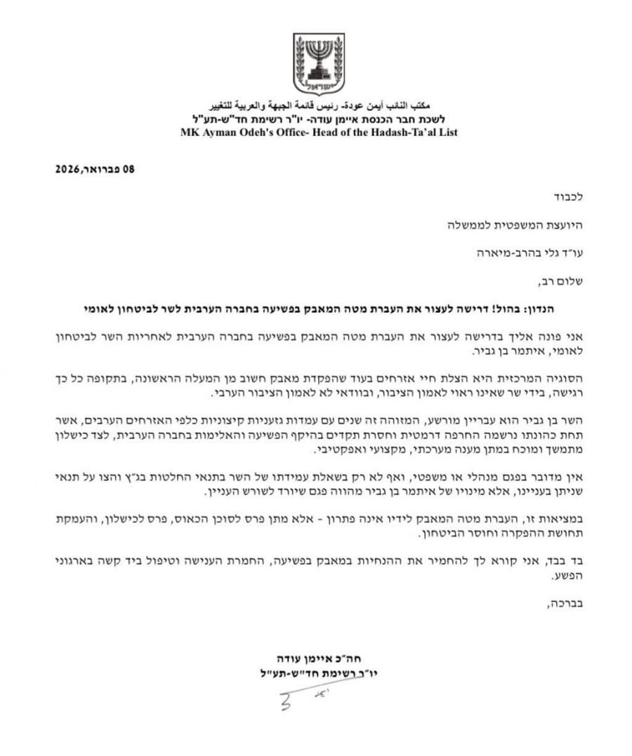 توجّه النائب أيمن عودة، رئيس قائمة الجبهة والعربية للتغيير، إلى المستشارة القضائية للحكومة، المحامية غالي بهاراف-ميارا، مطالبًا بوقف فوري لقرار نقل طاقم مكافحة الجريمة الوزاري في المجتمع العربي إلى مسؤولية الفاشي العنصري إيتمار بن غفير.