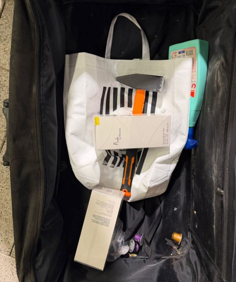 واستخدم المتهم مطرقة لتحطيم واجهة محل (فارم)، وسرق زجاجات عطر. وقد تم القبض عليه بعد مطاردة قصيرة وبحوزته المسروقات والأداة.