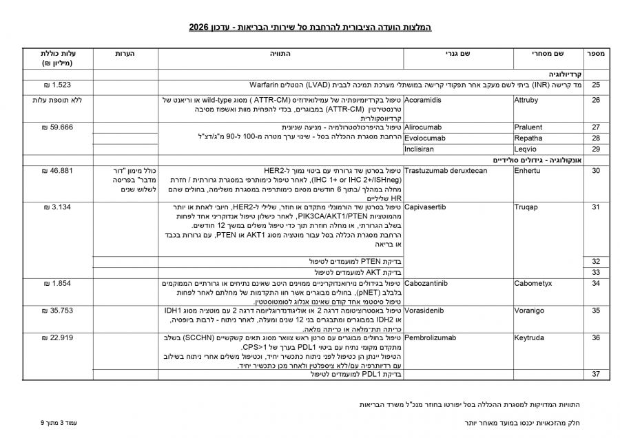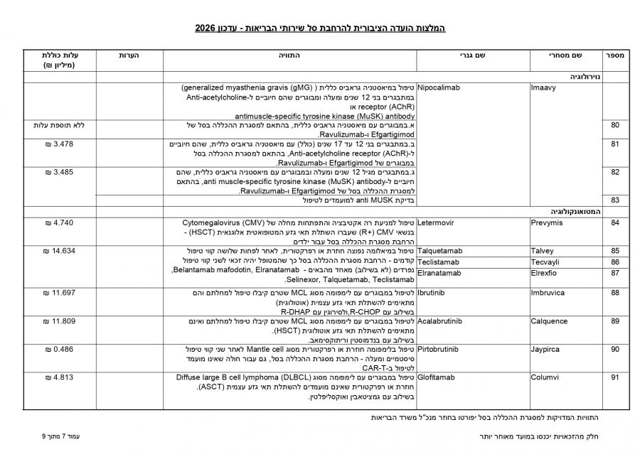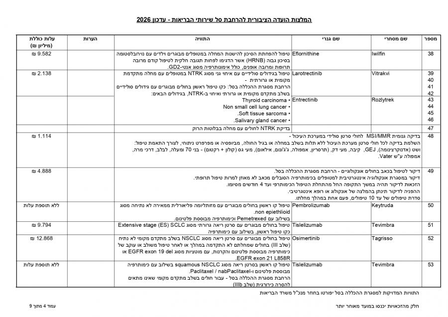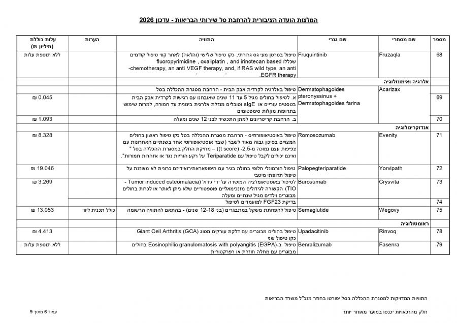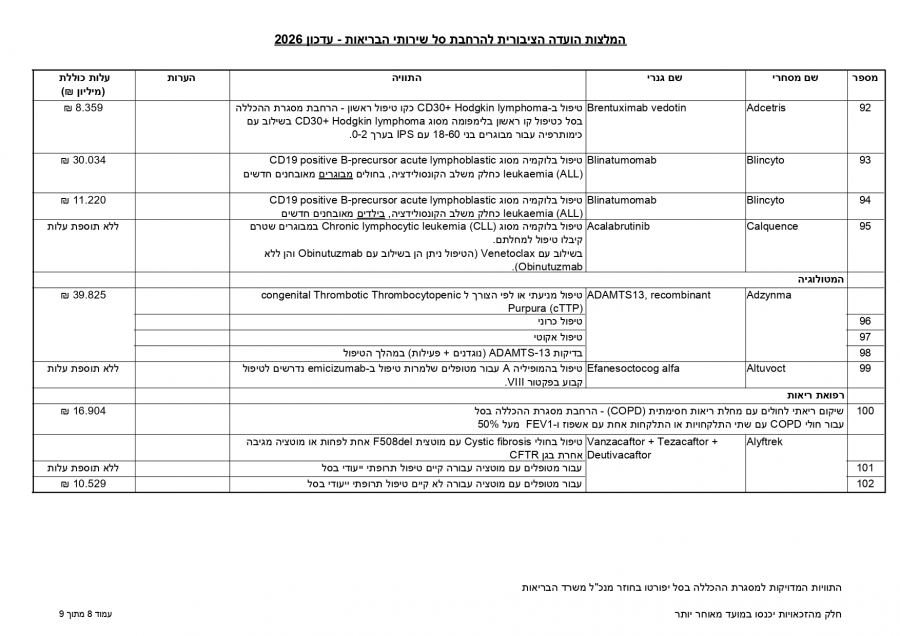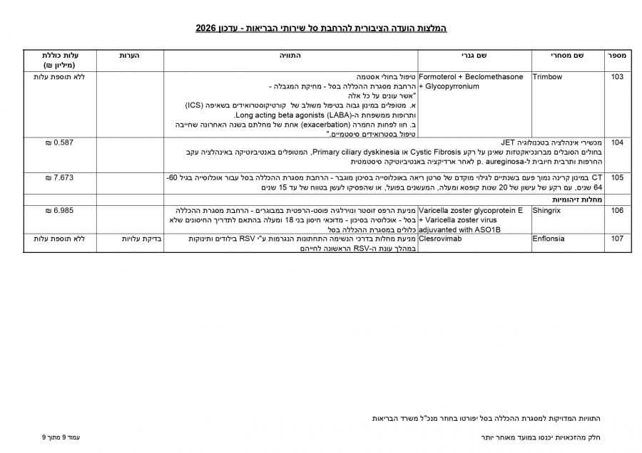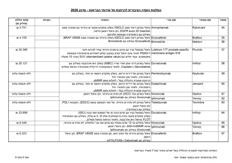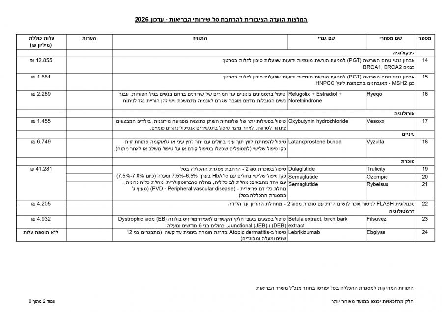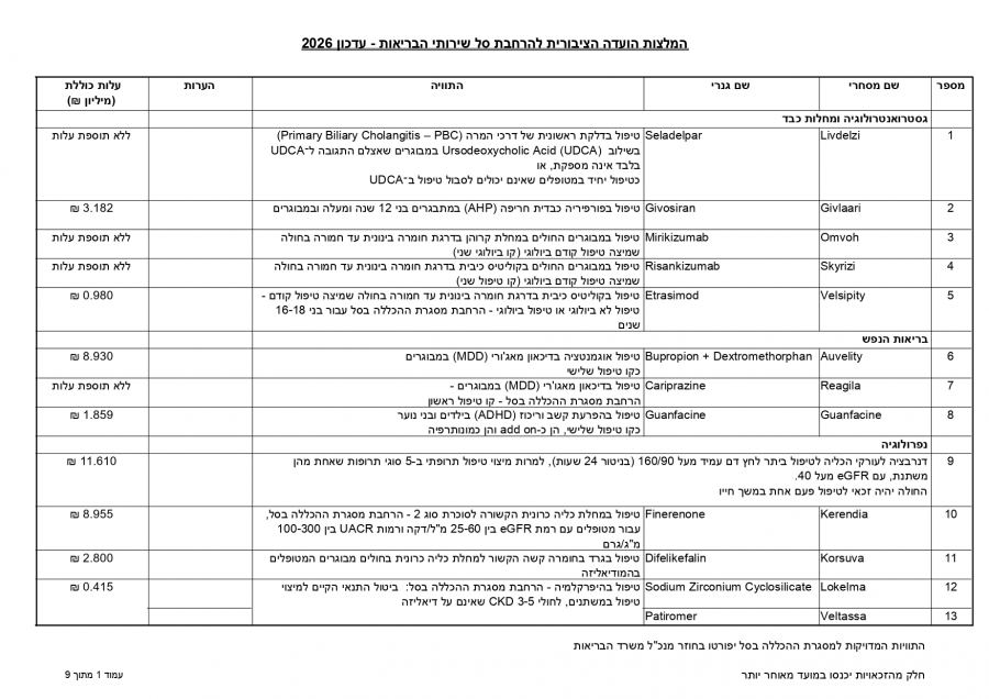 توصي اللجنة العامة لتوسيع سلة خدمات الصحة بإدخال 107 أدوية وتقنيات جديدة لتقديم استجابة علاجية لنحو 86,450 شخصًا، بكلفة إجمالية تبلغ 650 مليون شيكل لعام 2026.
