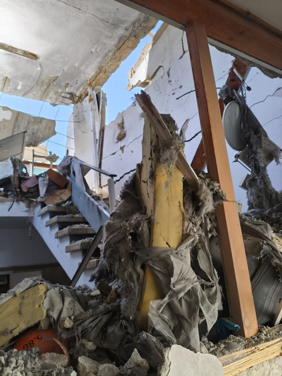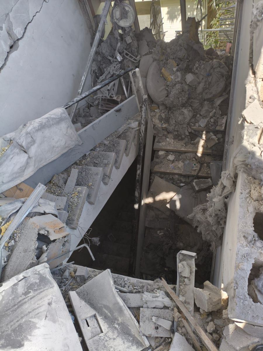 في عراد: سقط الصاروخ بين مبانٍ سكنية، ما تسبب بأضرار جسيمة في ثلاثة مبانٍ واشتعال حريق في إحدى الشقق.